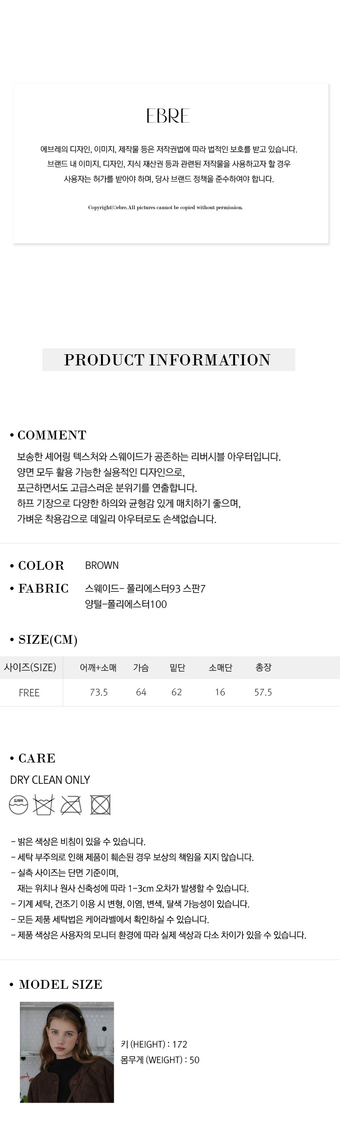 에브레(EBRE)는 'exclusive(독점적이고)', 'beloved(사랑받고)', 'refined experience(세련된 경험)'의 약자로 미니멀하며 편하게 입을 수 있는 디자인을 선호하는 여성복 디자이너 브랜드입니다. 우리는 트렌드를 해석해 옷에 표현하고, 대중적이고 예쁘게 입을 수 있는 핏을 연구합니다. 편안하고 아름다울 수 있는 핏을 중점적으로 연구하고, 좋은 원단에 합리적인 가격대의 옷을 만들기 위해 원단 서칭 및 패턴 수정, 옷의 품질을 최우선으로 생각합니다.