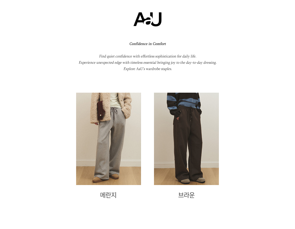 에이에이유(AAU)는 당신의 모든 것을 위한, 당신에게 집중하는 브랜드로 내 몸에 맞춘 듯한 편안함과 격식에 구애받지 않는 데일리 아이템으로 일상에 한 포인트의 멋을 더하는 브랜드입니다.