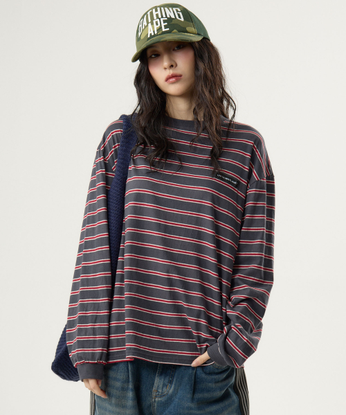 아이비 스트라이프 라운드 롱슬리브 티셔츠 그레이