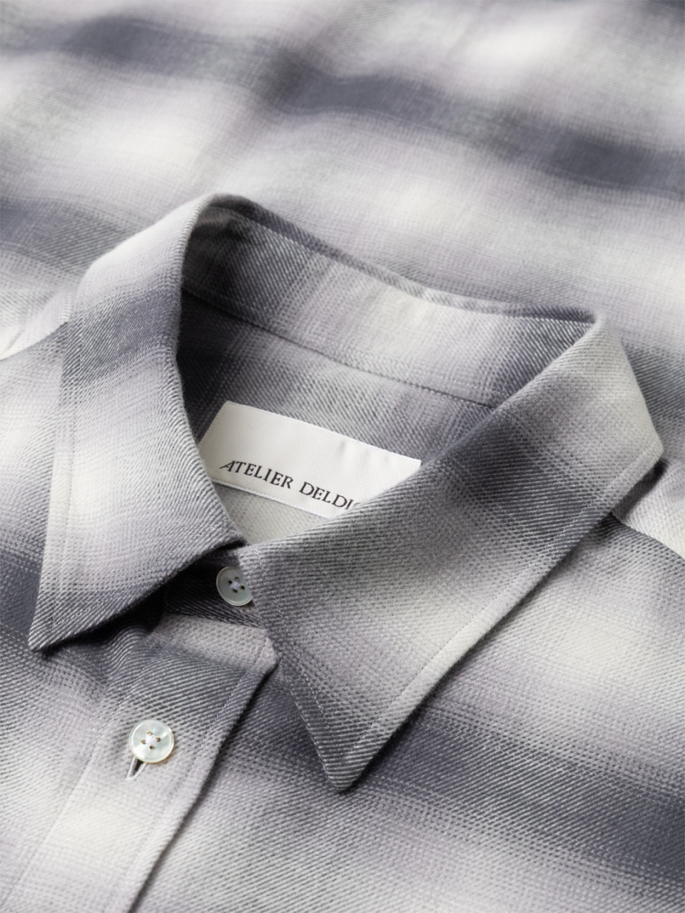성수동에 위치한 아틀리에 델디오의 자체 공방에서 생산하였습니다. 인치당 18땀 이상의 촘촘한 봉제를 하였으며, 100% 쌈솔봉제(single needle stitching) 방식으로 제작됩니다. 좀 더 깔끔한 룩을 위해 워싱을 생략하고 실크심지를 사용하였습니다. 델디오의 모든 셔츠는 독일산 귀터만(Güterman) 실과 천연 자개단추를 사용합니다.