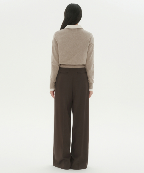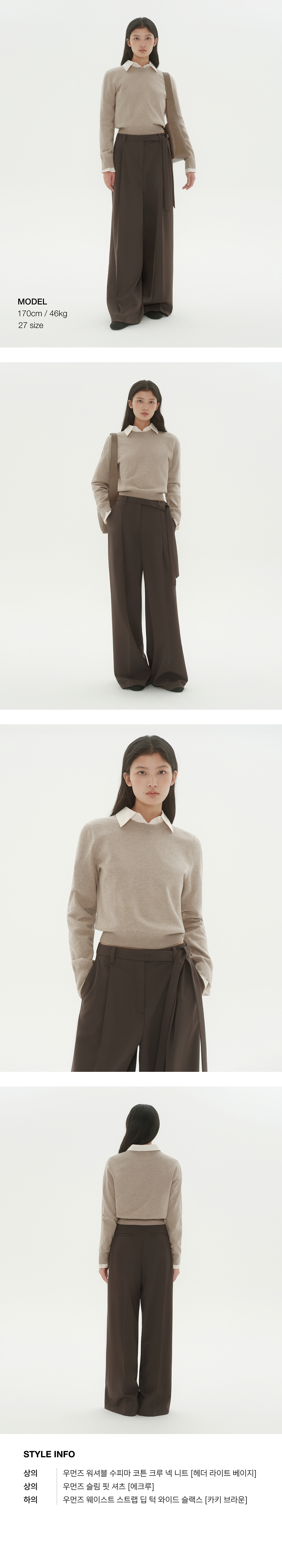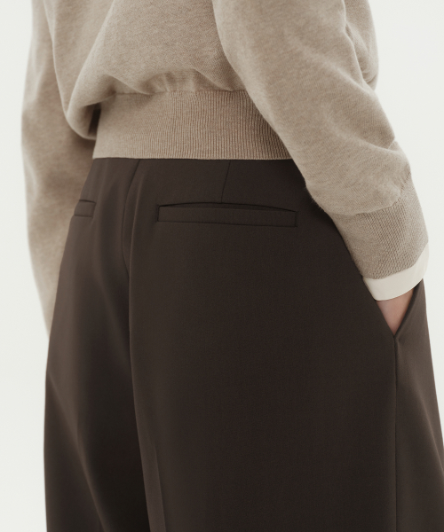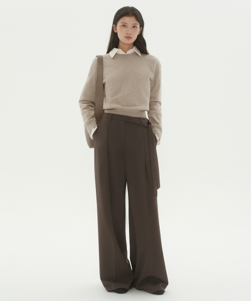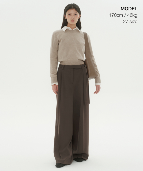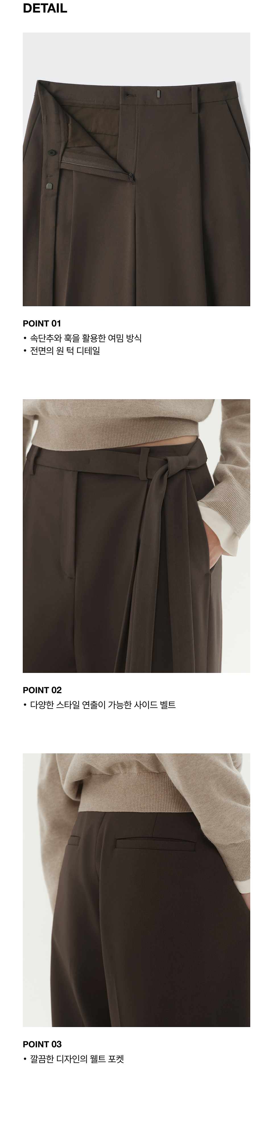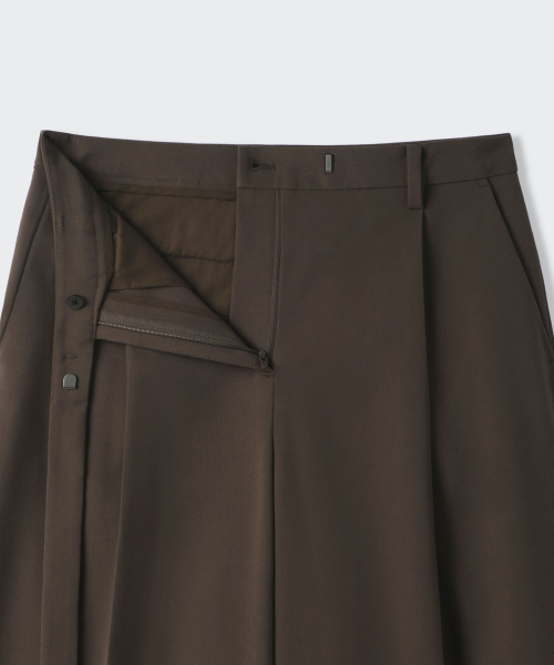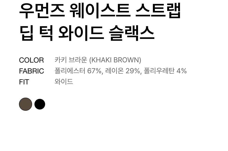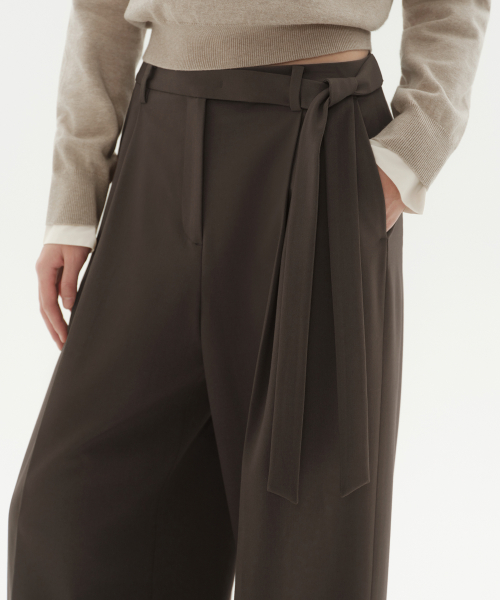 우먼즈 웨이스트 스트랩 딥 턱 와이드 슬랙스 [카키 브라운]