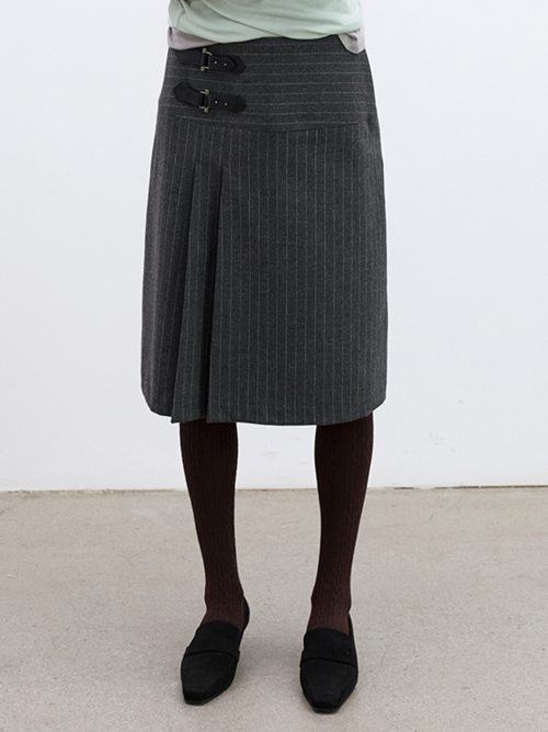 클래식한 핀스트라이프 패턴에 구조적인 디테일을 더해 완성된 울 혼방 스커트입니다.