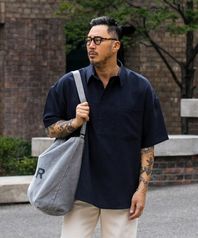 라이트 윈드 반오픈 오버핏 반팔 셔츠 네이비