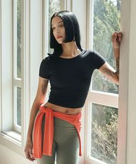 여성 요가복 DEVI-T0107-블랙 필라테스 오픈백 스트랩 숏슬리브