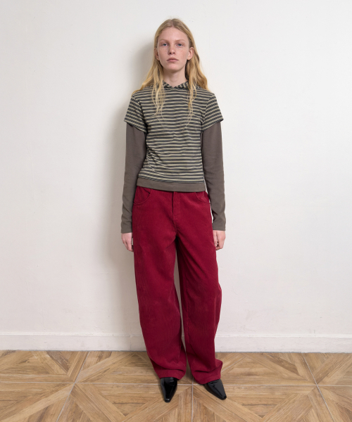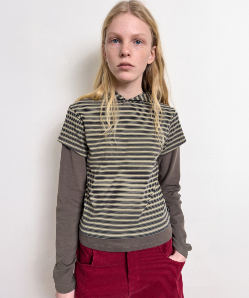 - 스트라이프 반팔 후디와 솔리드 긴팔 소매의 레이어드 디자인.
