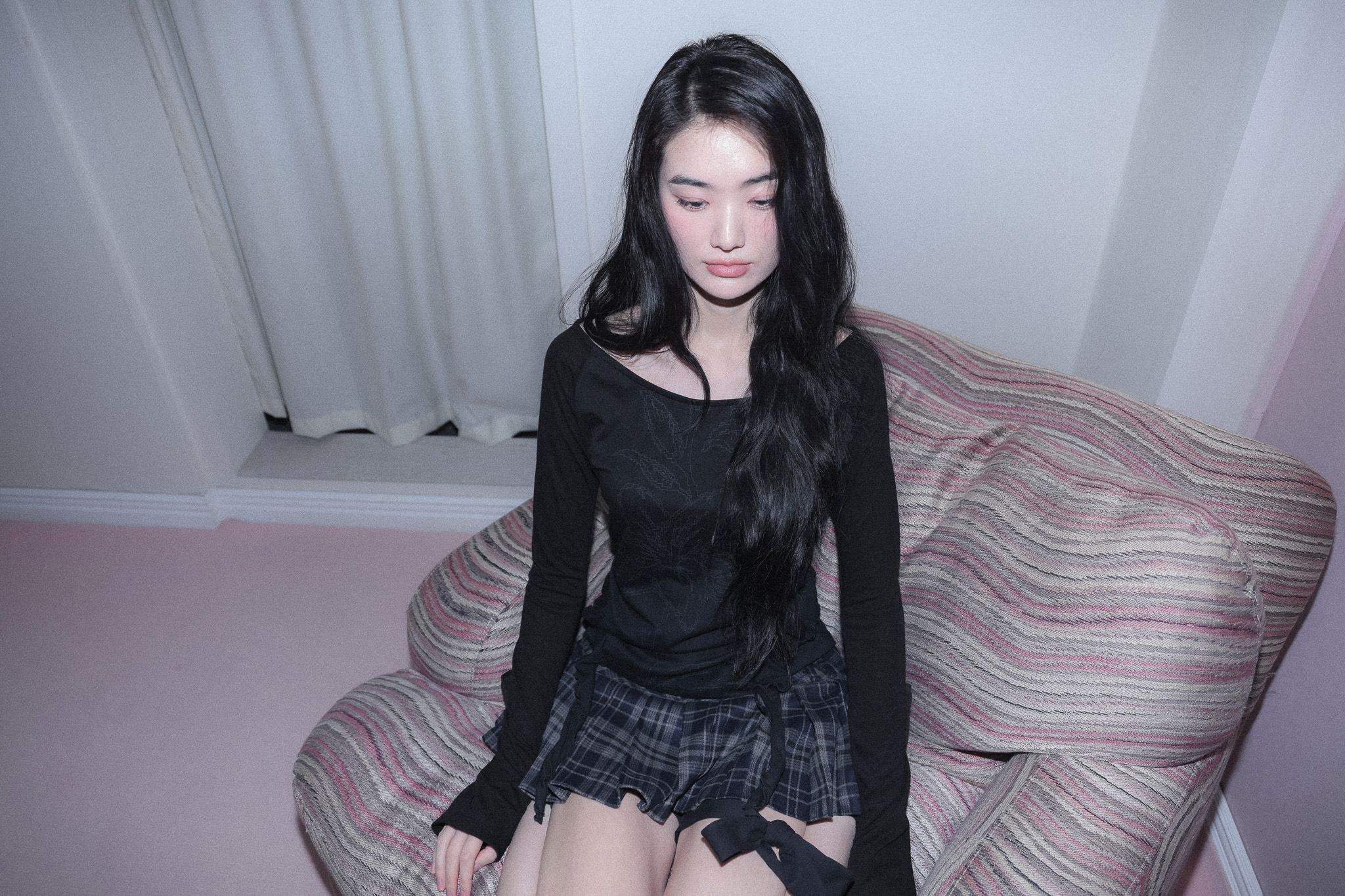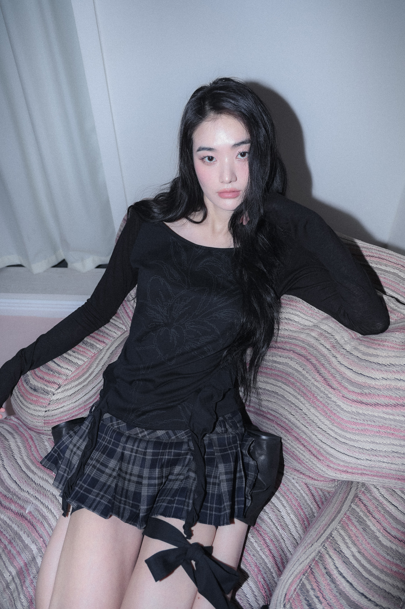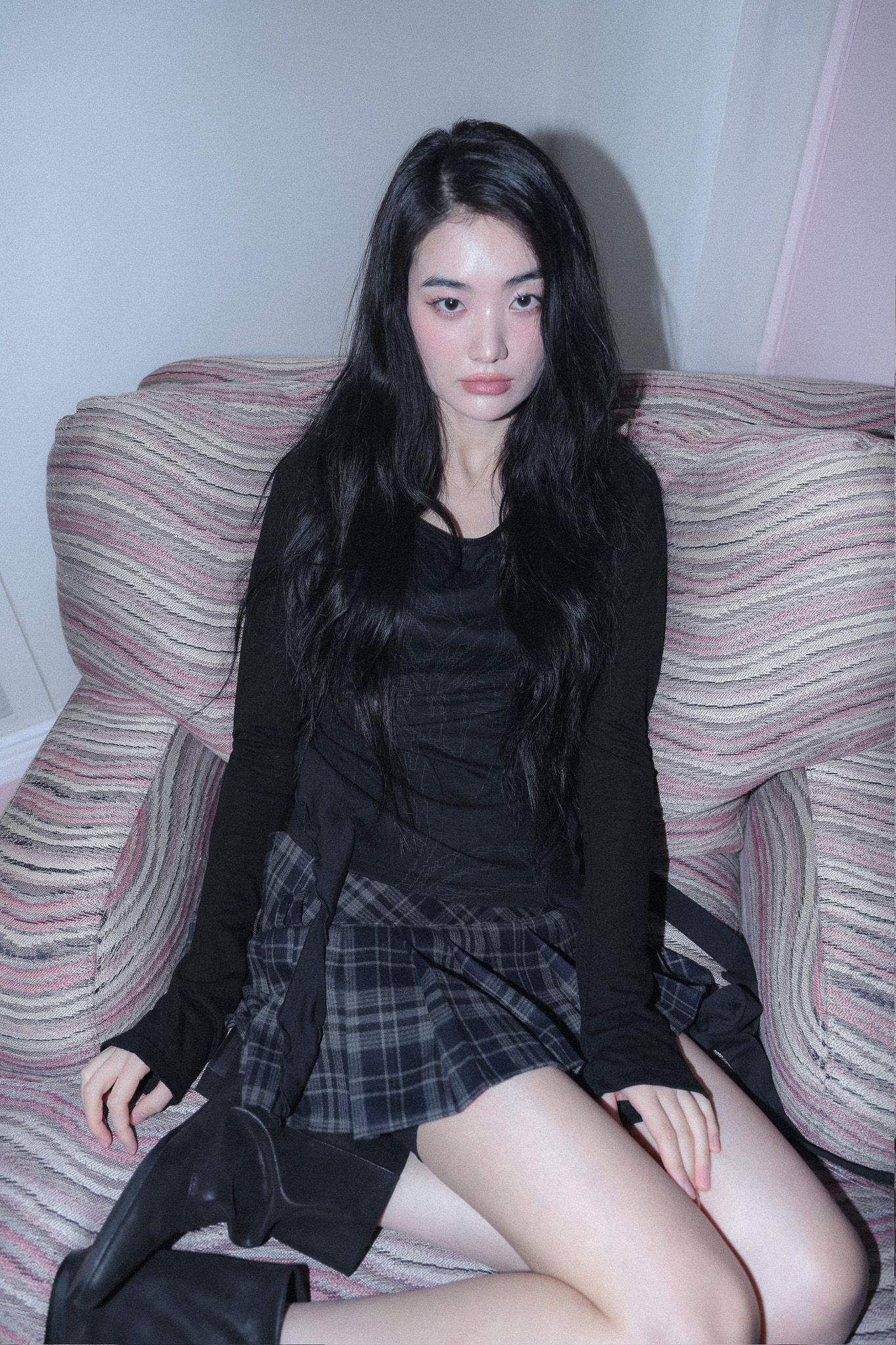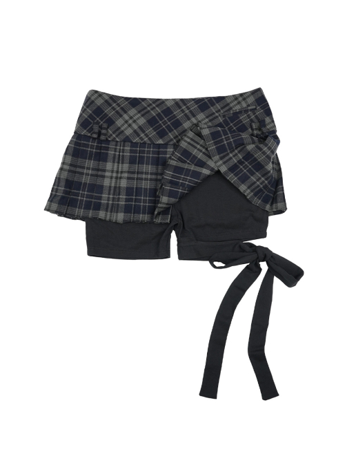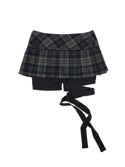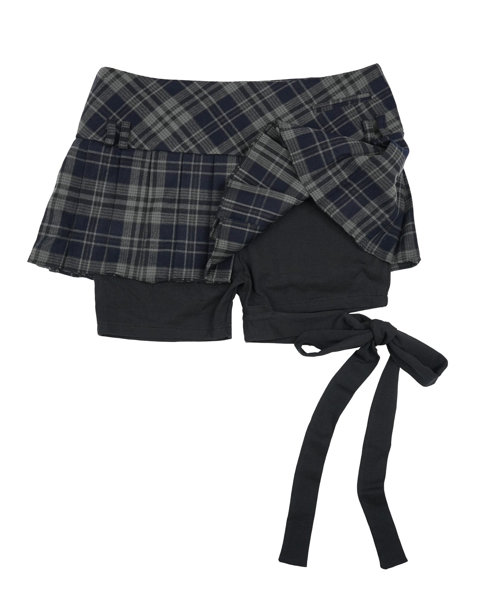 MATERIAL1 - P67 R30 PU3 MATERIAL2 - C95 SP5 - 중간 정도의 로우웨이스트 핏 - 바지가 노출되는 형태의 치마바지 - 바지 한쪽 밑단 제원단 끈 - 한쪽 립포켓 & 더블 벨트고리 - 속바지 신축성 좋은 스판 원단 MODEL SIZE 165cm/ size1 착용