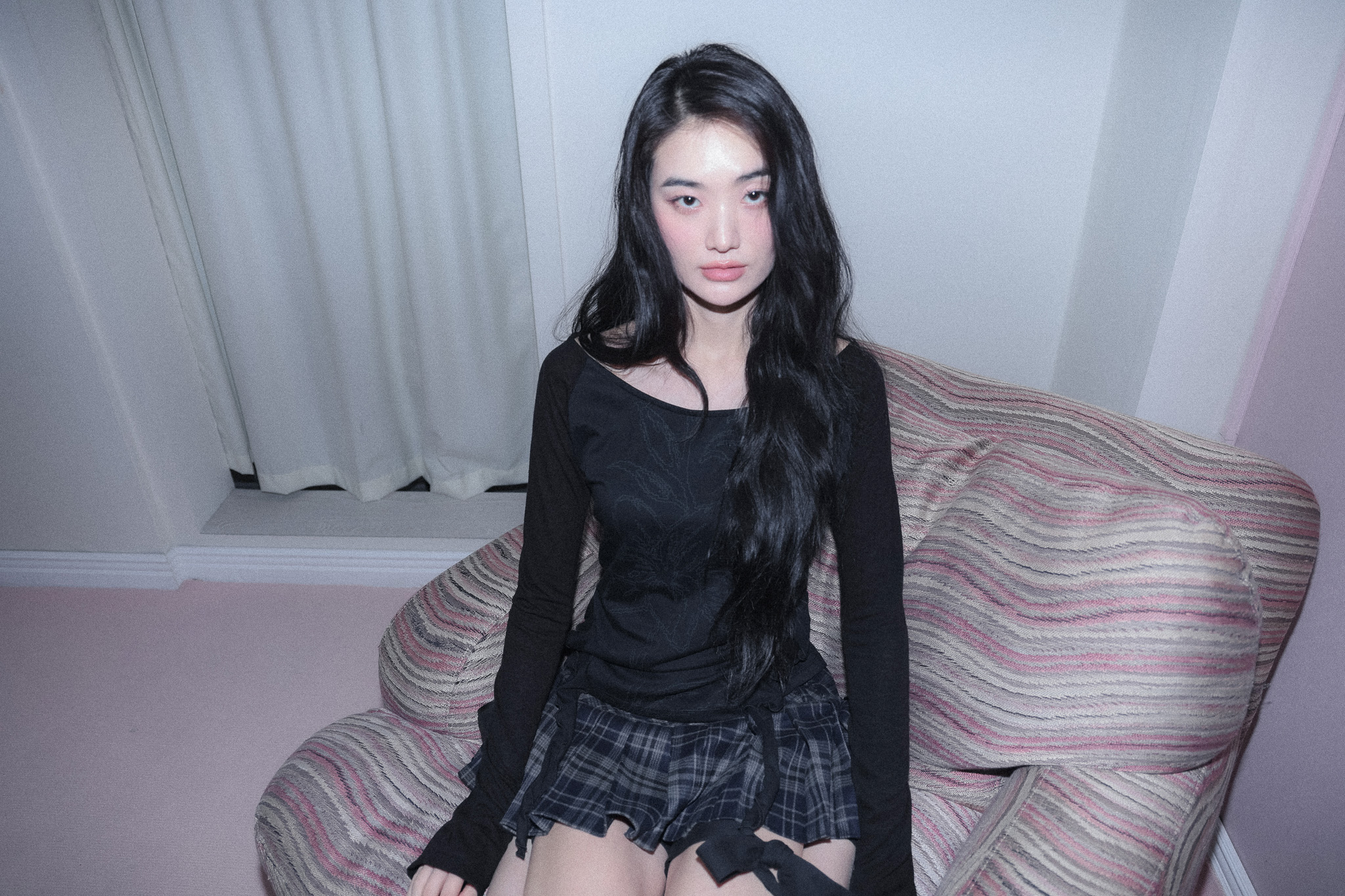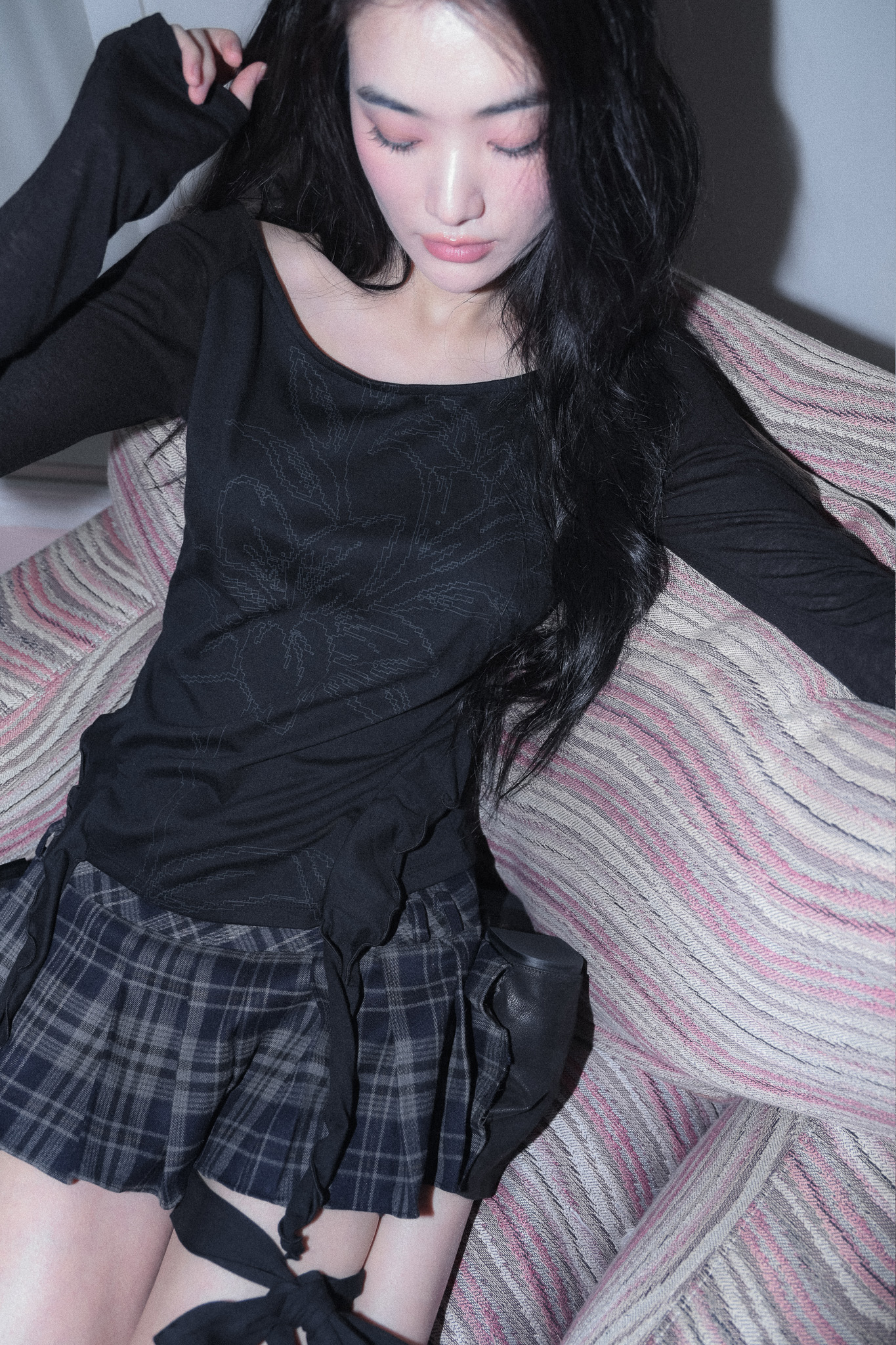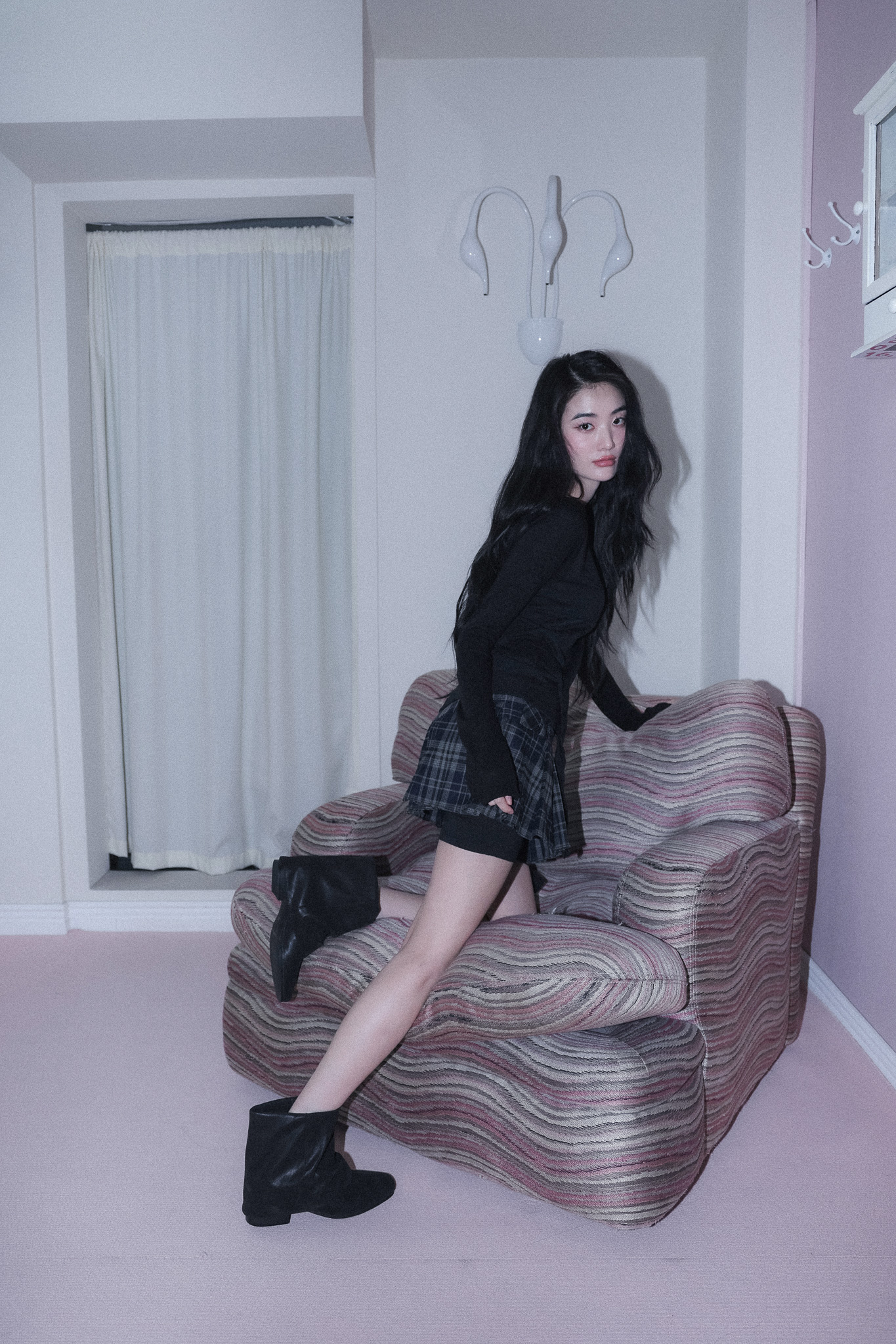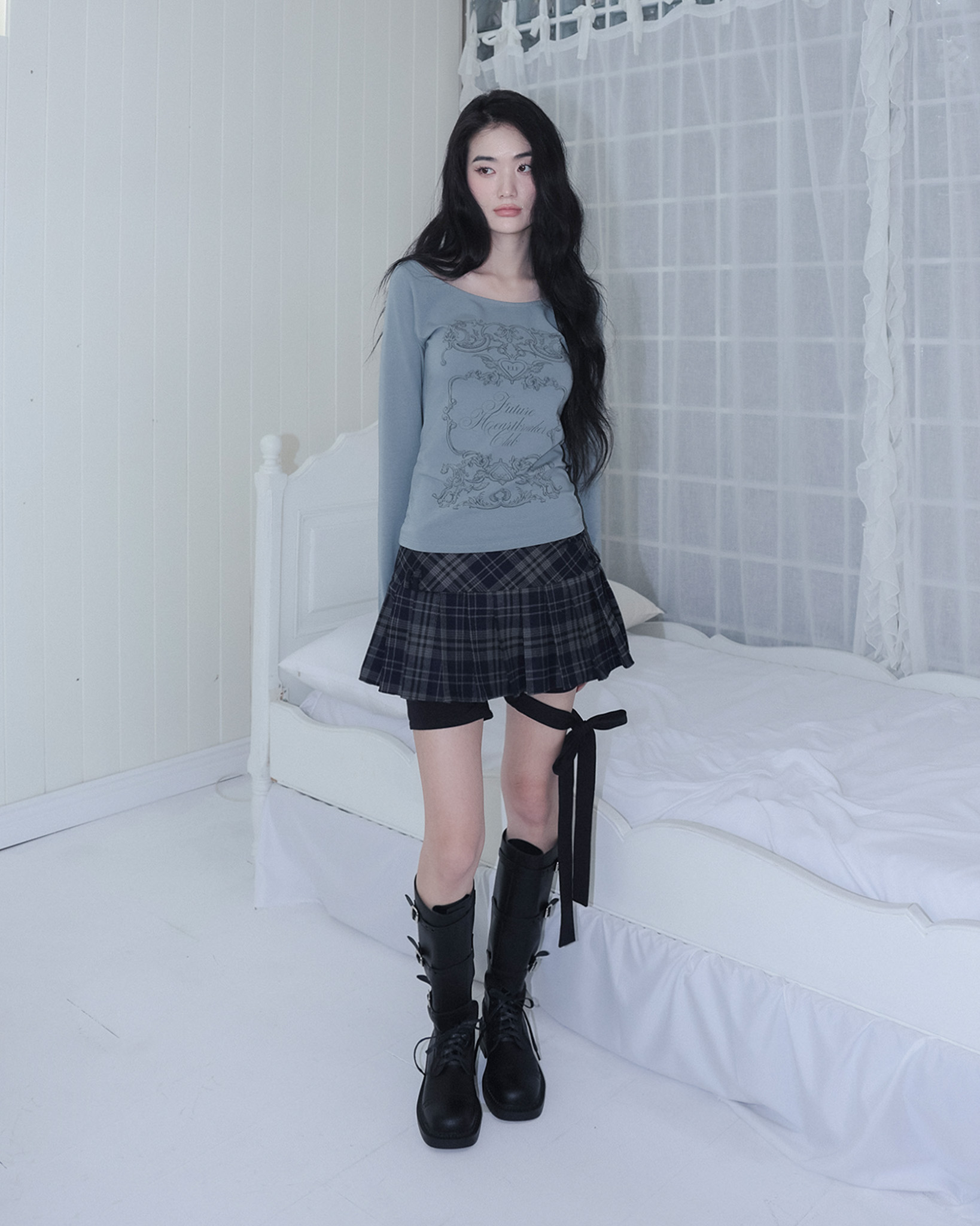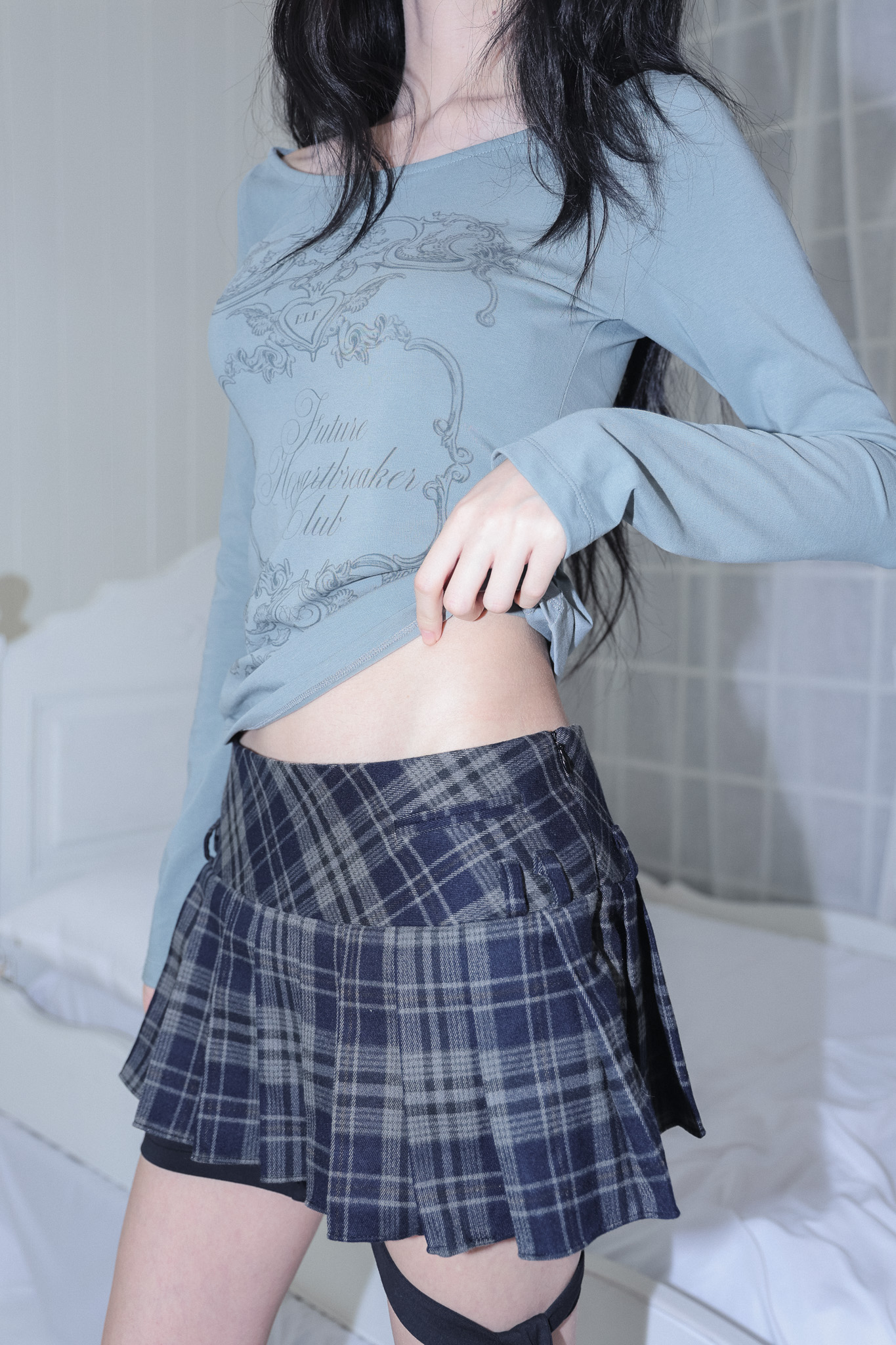 MATERIAL1 - P67 R30 PU3 MATERIAL2 - C95 SP5 - 중간 정도의 로우웨이스트 핏 - 바지가 노출되는 형태의 치마바지 - 바지 한쪽 밑단 제원단 끈 - 한쪽 립포켓 & 더블 벨트고리 - 속바지 신축성 좋은 스판 원단 MODEL SIZE 165cm/ size1 착용