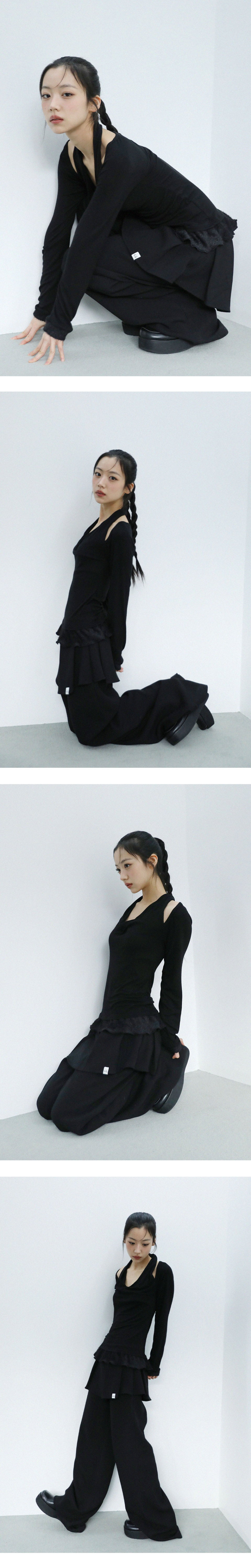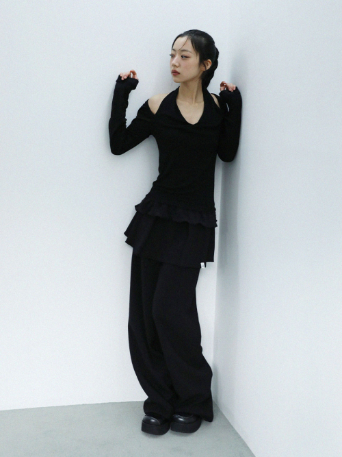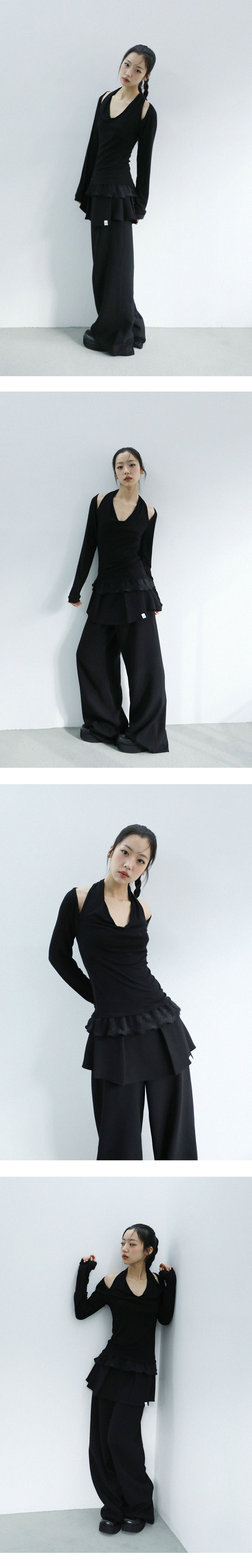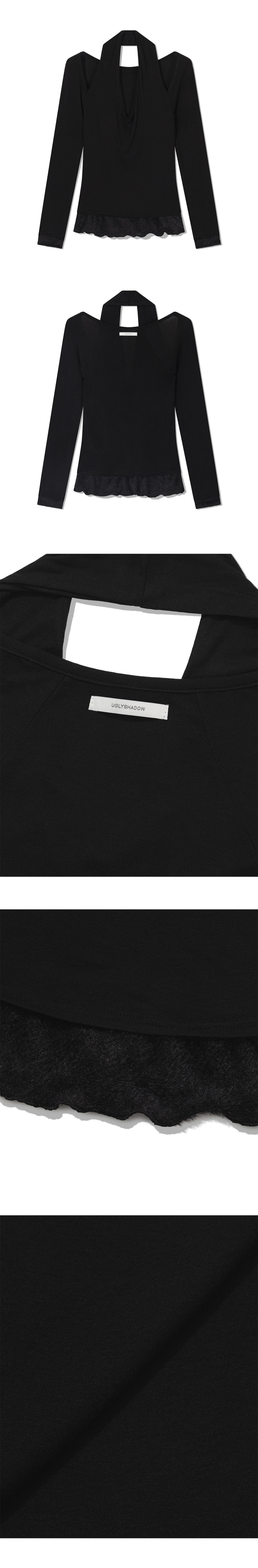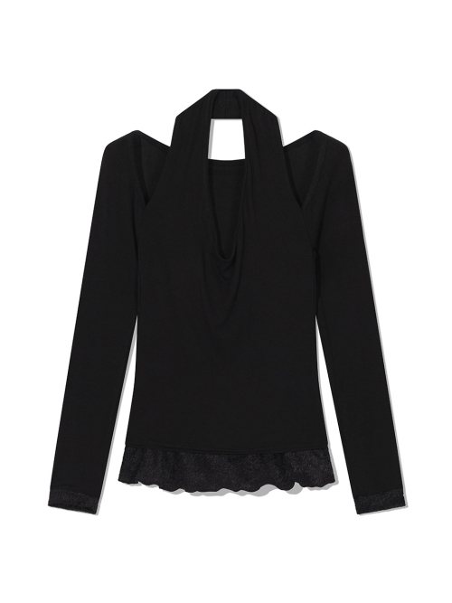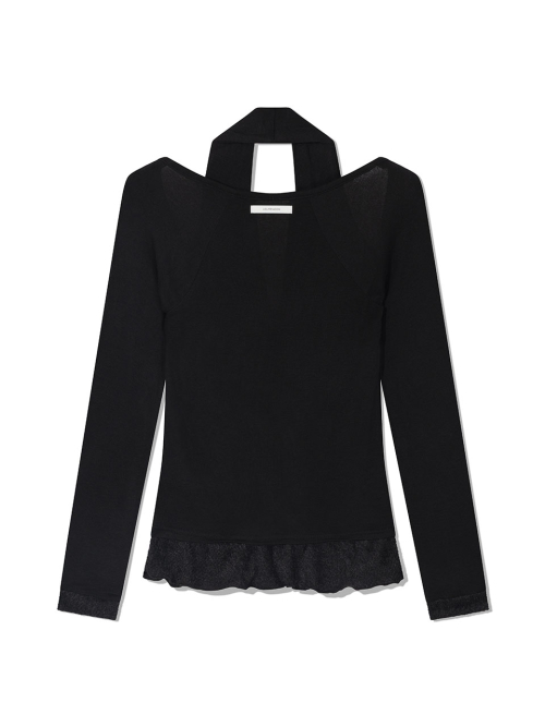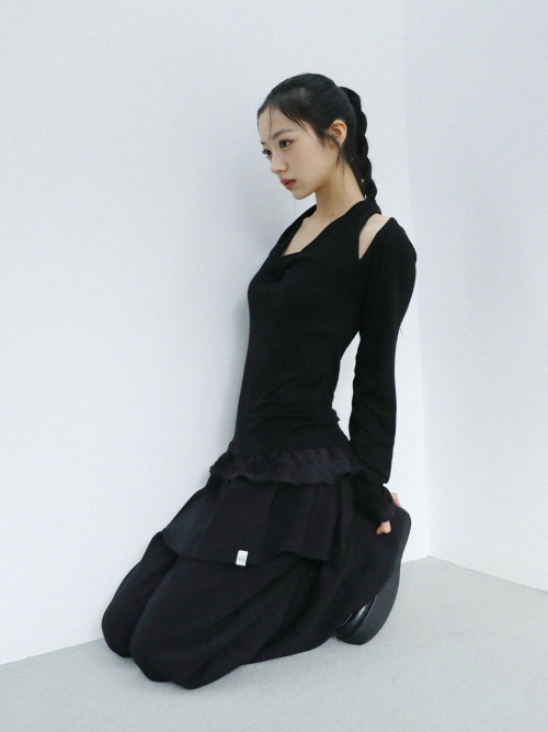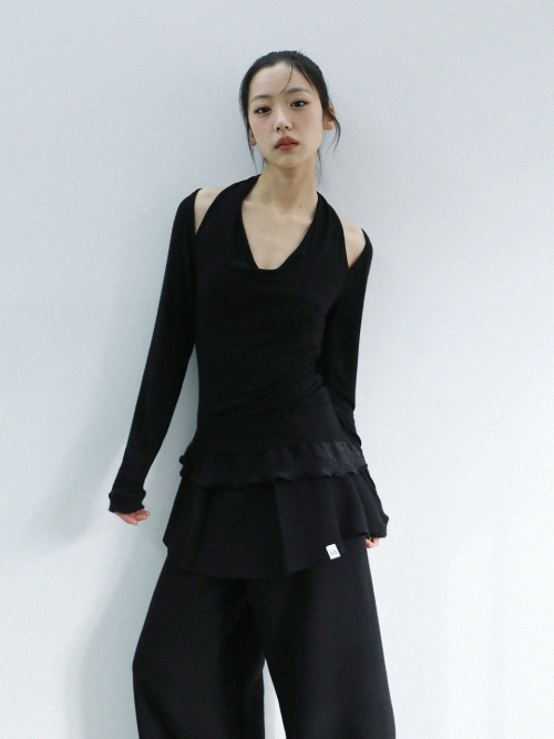 스카프처럼 자연스럽게 흘러내리는 실루엣이 연출 되는 디자인으로, 넥라인이 살짝 파여 보일 수 있습니다.
