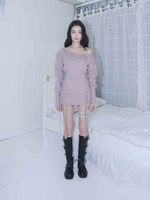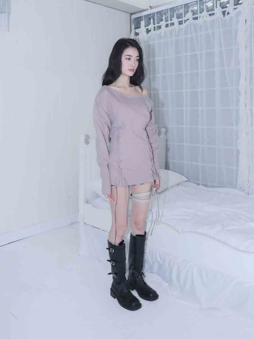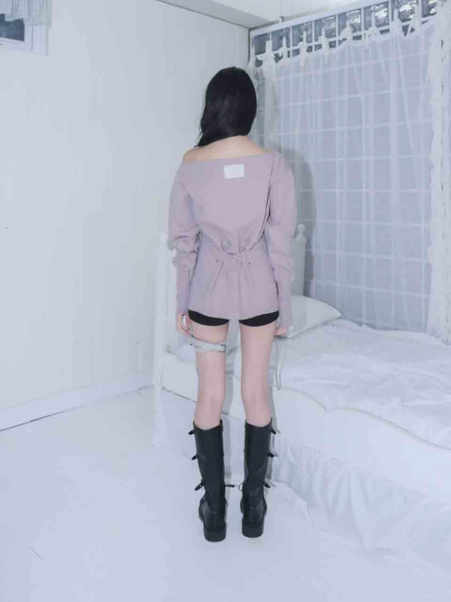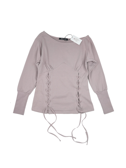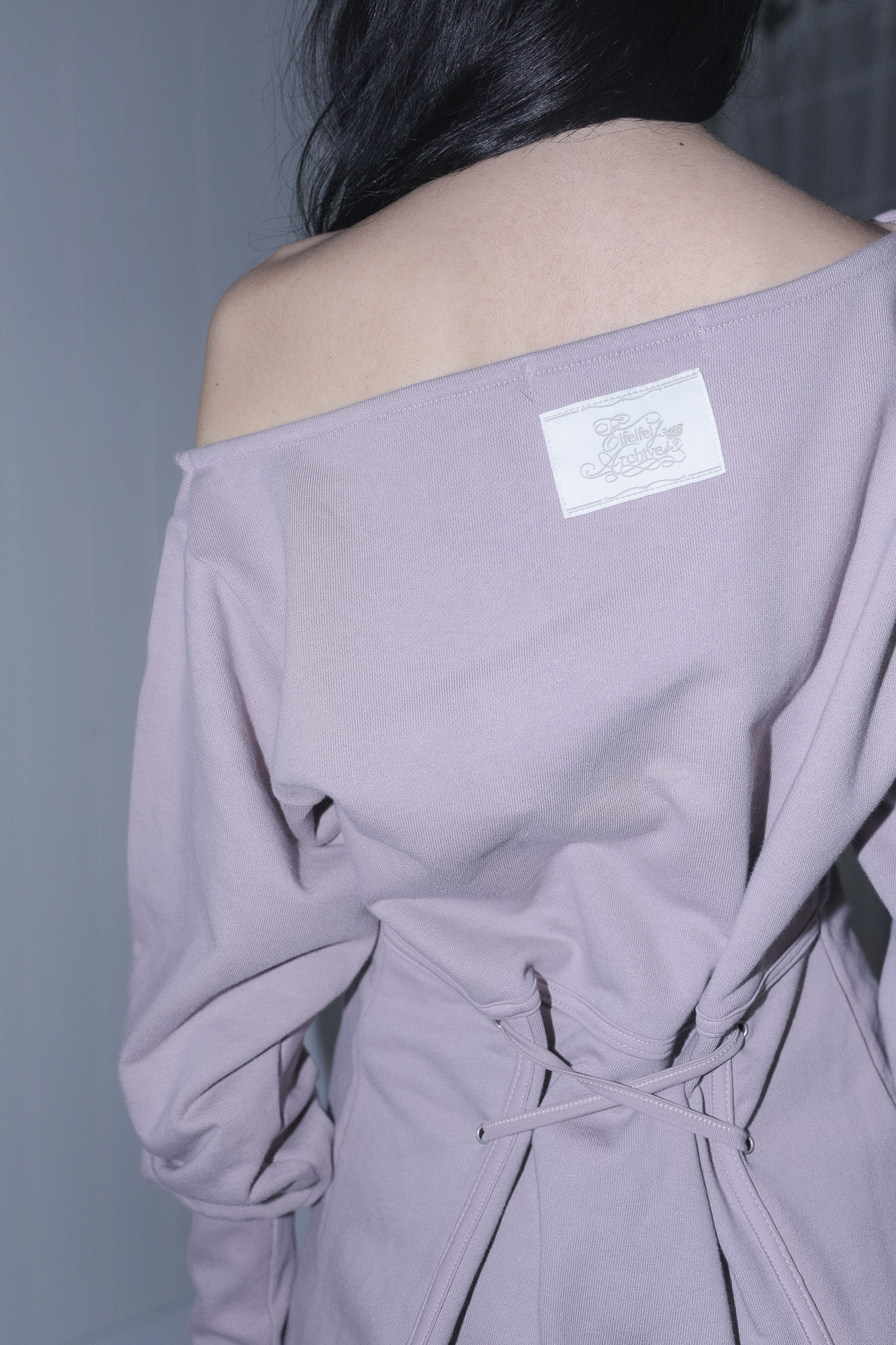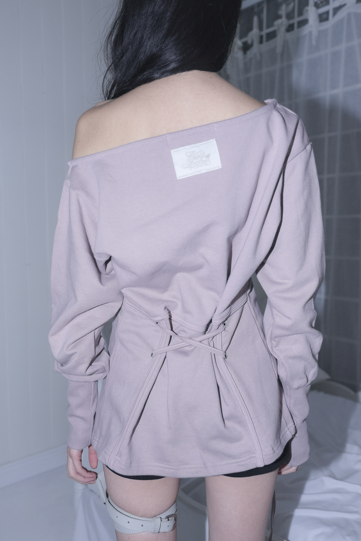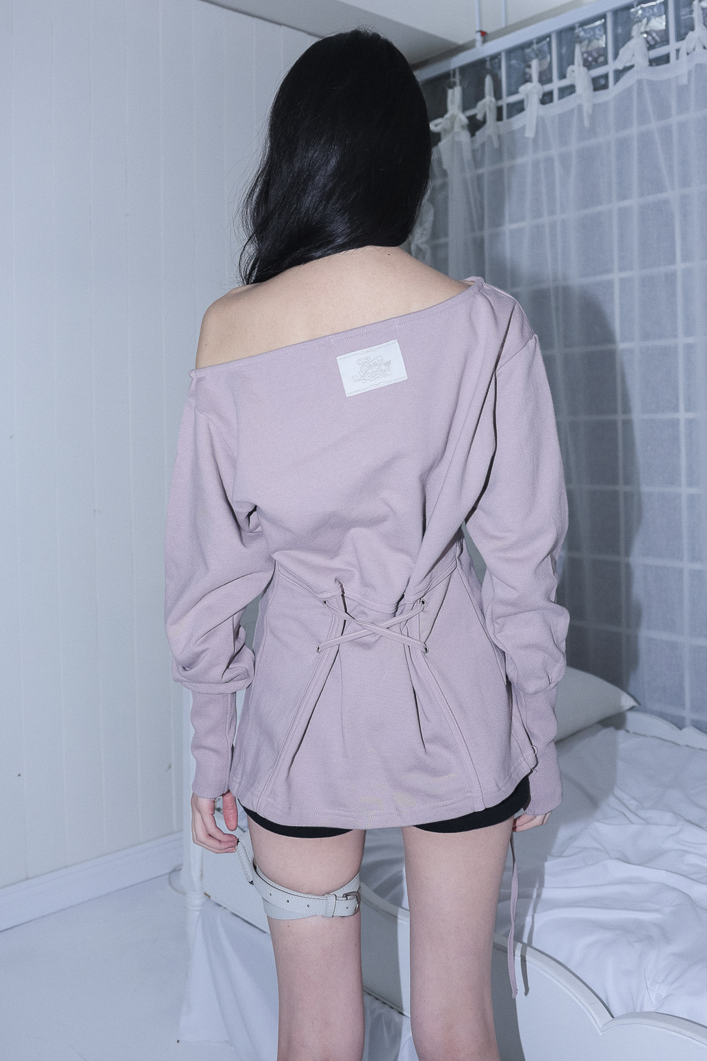 MATERIAL1 - C100 - 앞/뒷판 양쪽 코르셋 디테일 - 뒷판 코르셋 안쪽 리본으로 허리 둘레 조정가능 - 원 숄더 핏의 도톰한 맨투맨 - 뒷 목 중심 엔틱 로고 라벨 포인트 MODEL SIZE 165cm