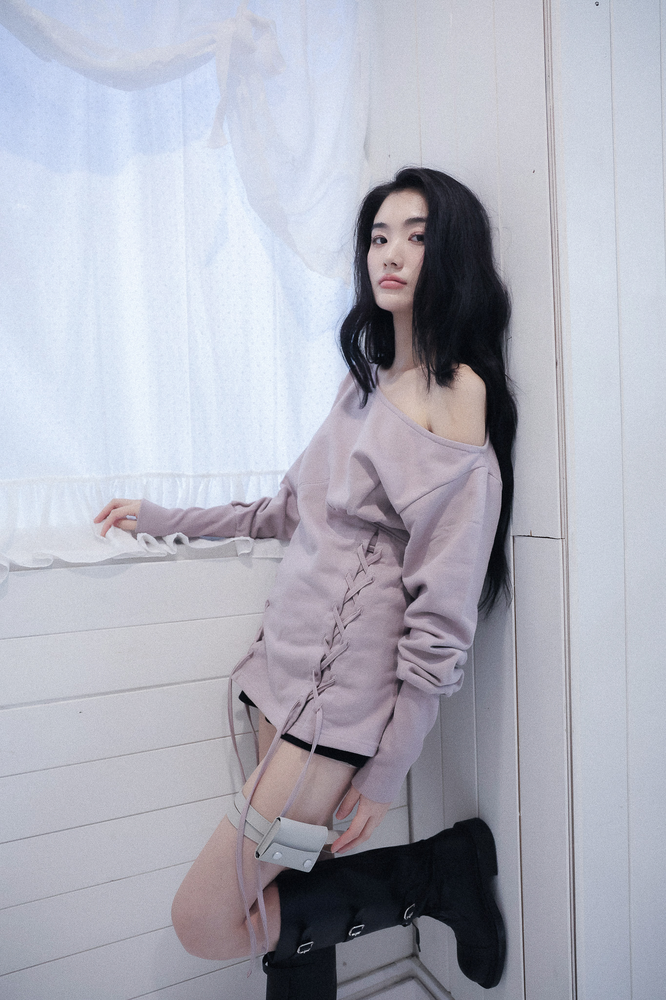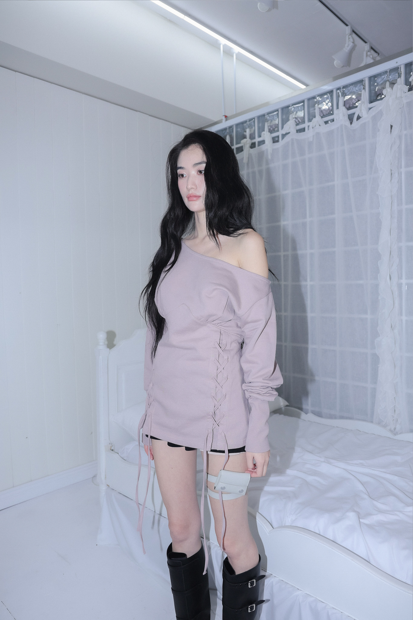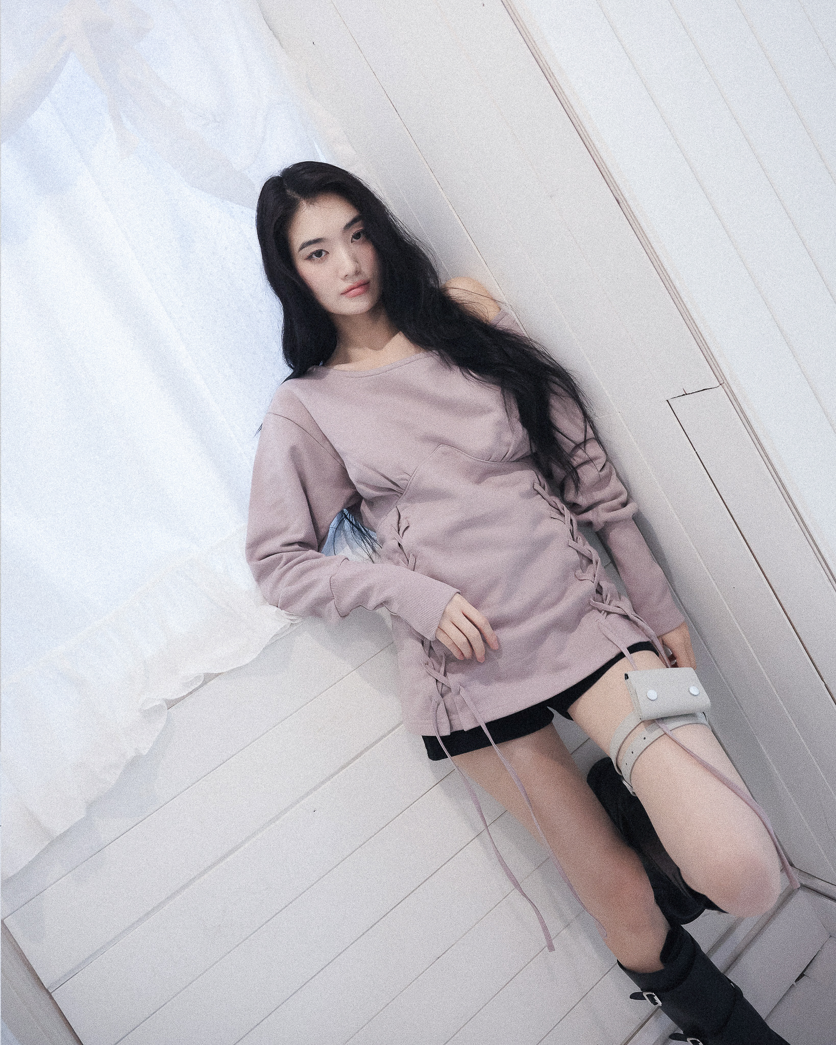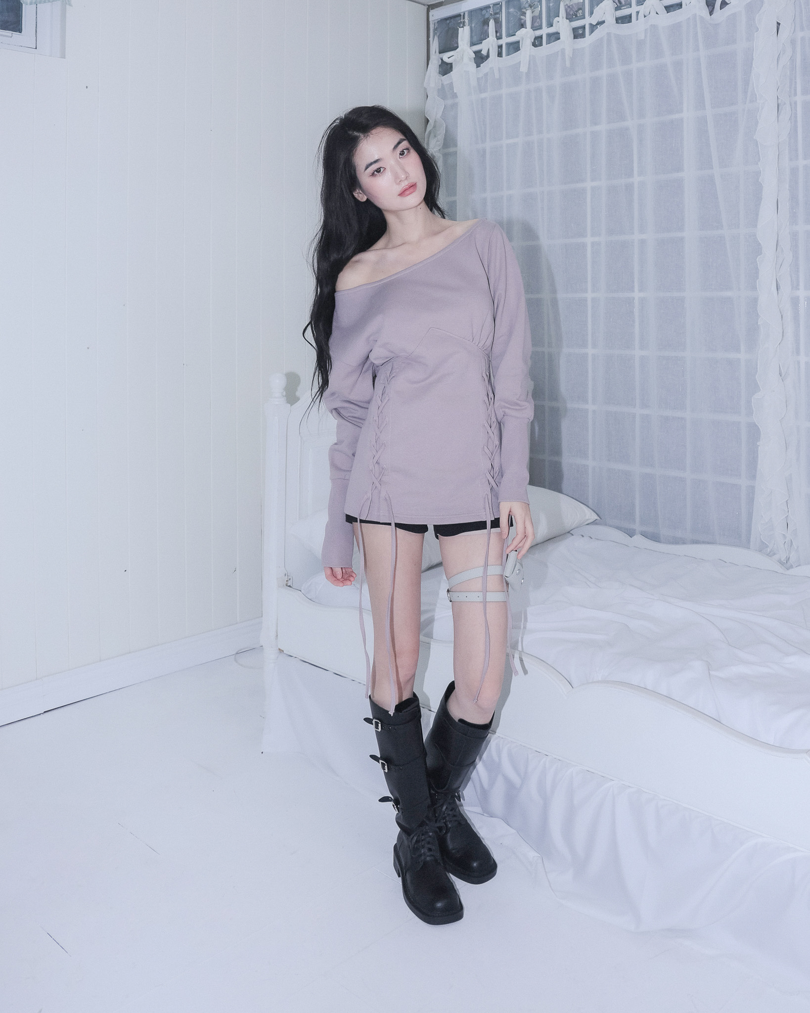 MATERIAL1 - C100 - 앞/뒷판 양쪽 코르셋 디테일 - 뒷판 코르셋 안쪽 리본으로 허리 둘레 조정가능 - 원 숄더 핏의 도톰한 맨투맨 - 뒷 목 중심 엔틱 로고 라벨 포인트 MODEL SIZE 165cm