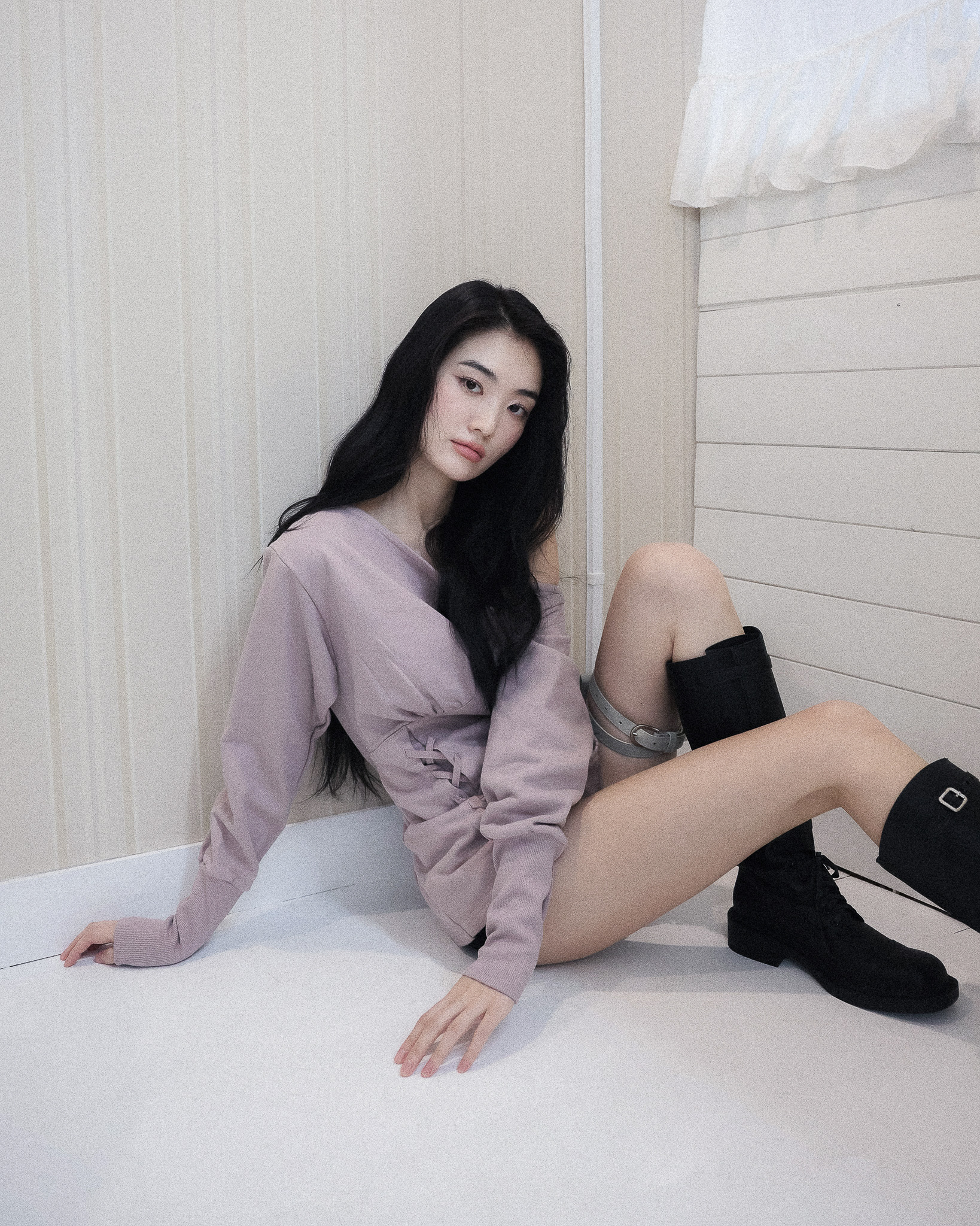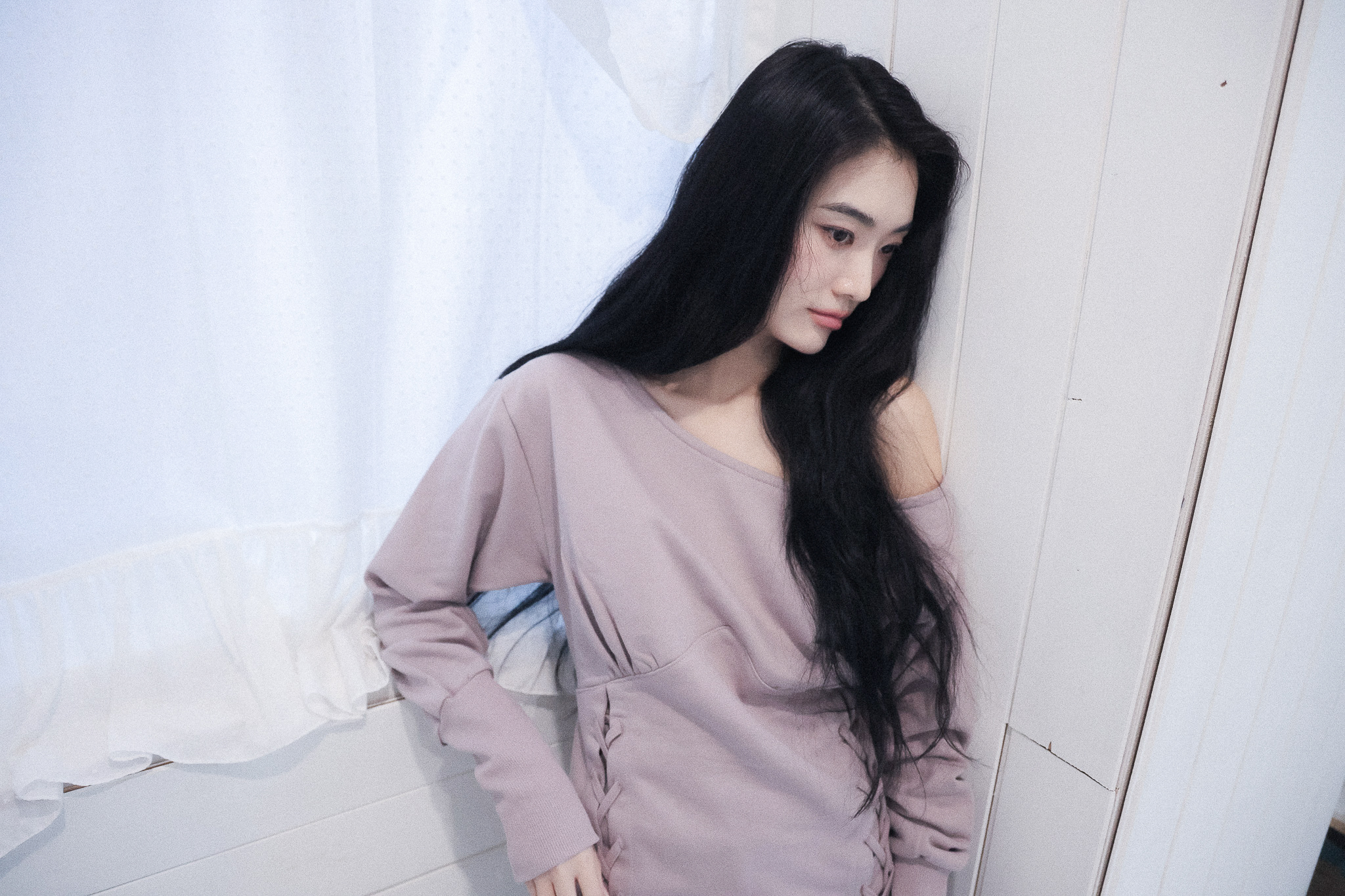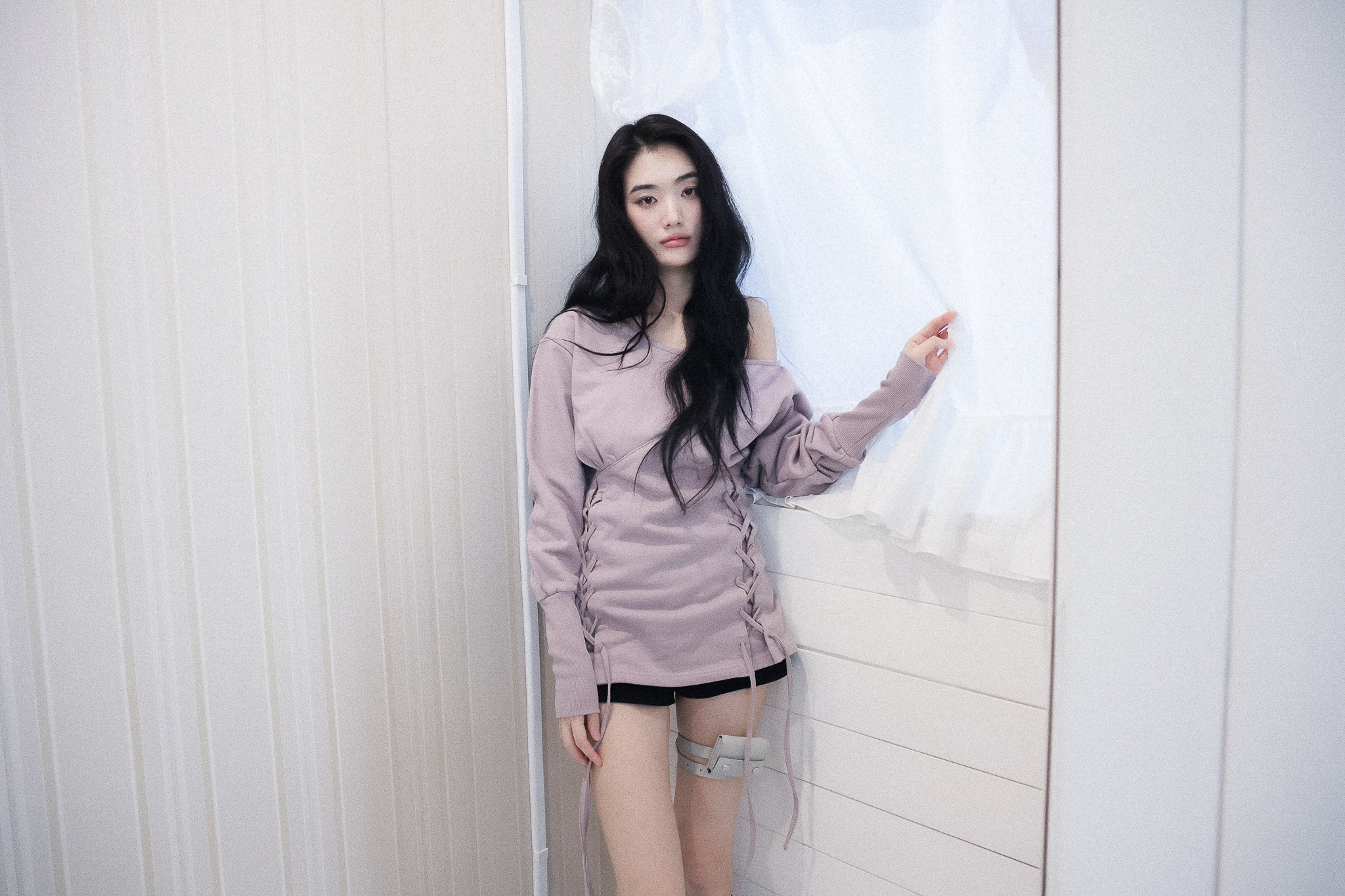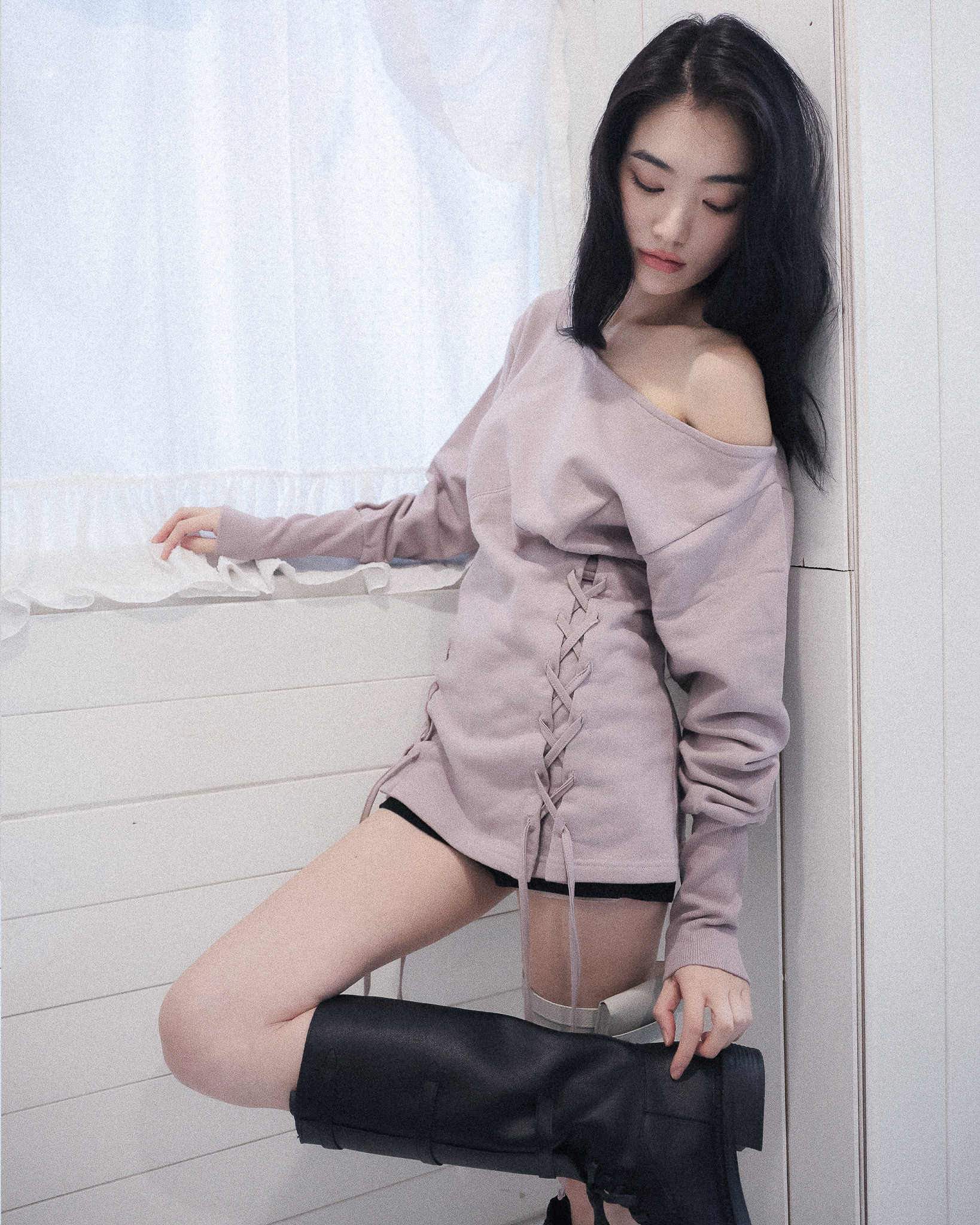 MATERIAL1 - C100 - 앞/뒷판 양쪽 코르셋 디테일 - 뒷판 코르셋 안쪽 리본으로 허리 둘레 조정가능 - 원 숄더 핏의 도톰한 맨투맨 - 뒷 목 중심 엔틱 로고 라벨 포인트 MODEL SIZE 165cm