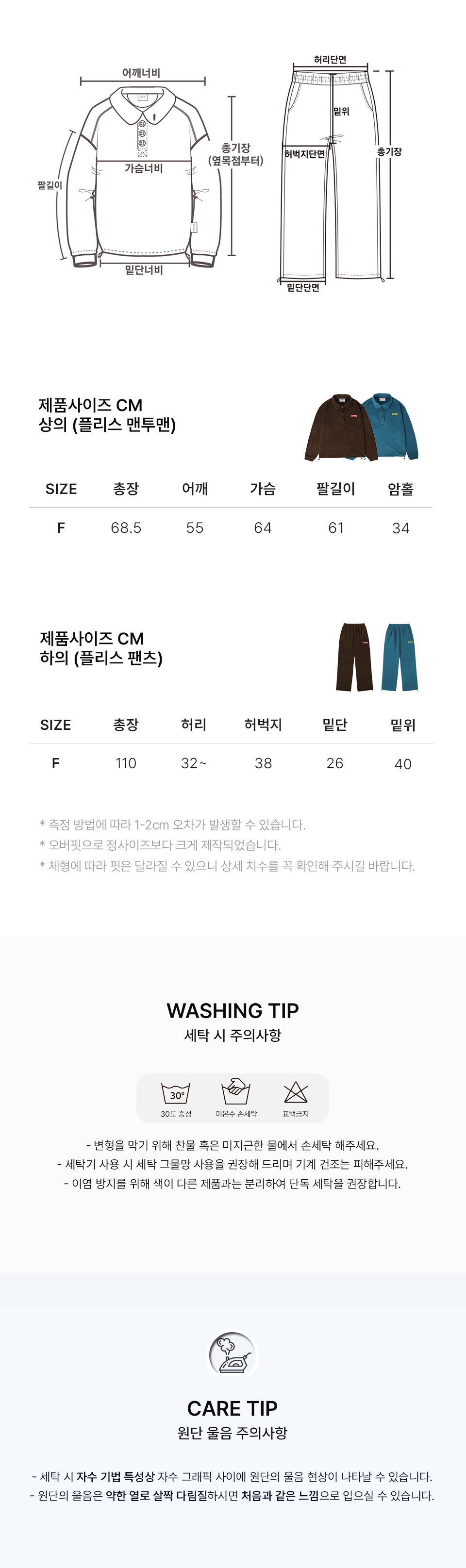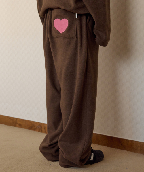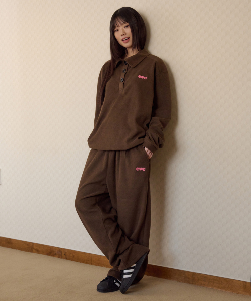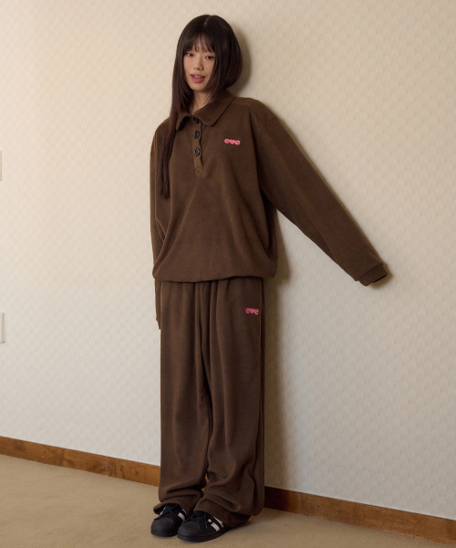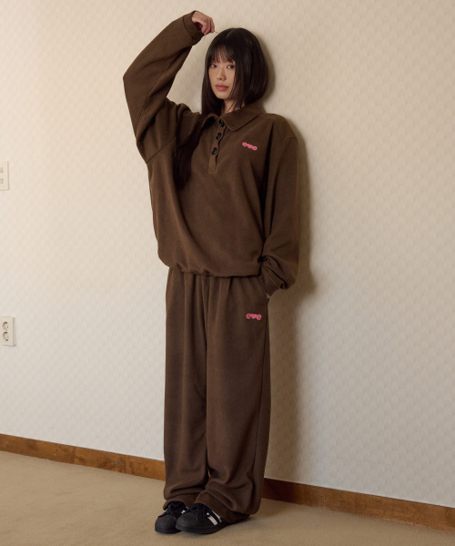[SET] Love, cozy 플리스 자수 풀오버 와이드 팬츠 셋업 (브라운)