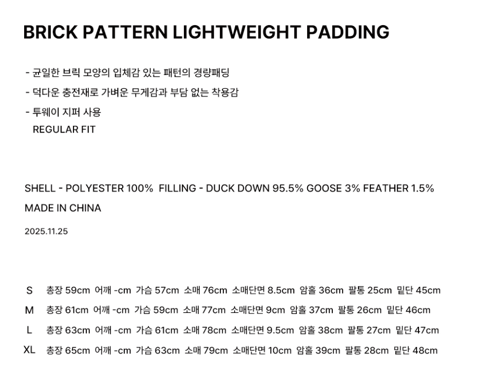 [덕다운] 브릭 패턴 라이트 웨이트 패딩
