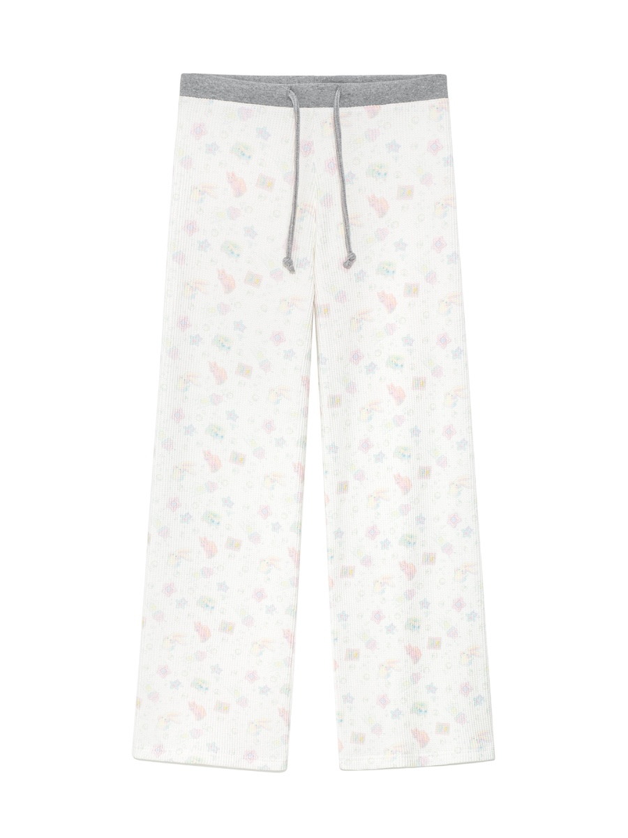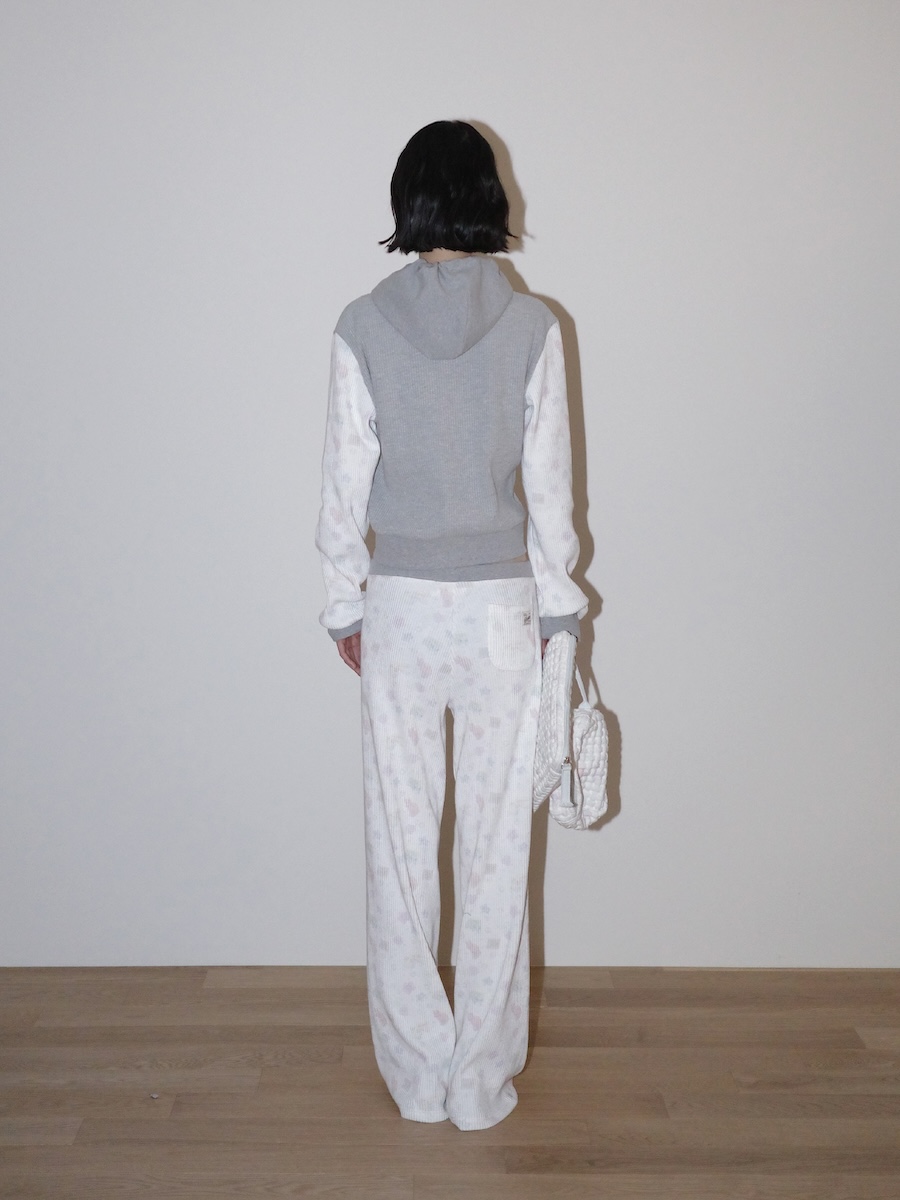 허리단과 허리끈에는 격자립 원단을, 몸판에는 따뜻한 와플 텍스처를 사용해 겨울 시즌에 포근한 무드를 더했으며, 전체적인 실루엣은 자연스럽게 로우라이즈 핏으로 착용할 수 있습니다.