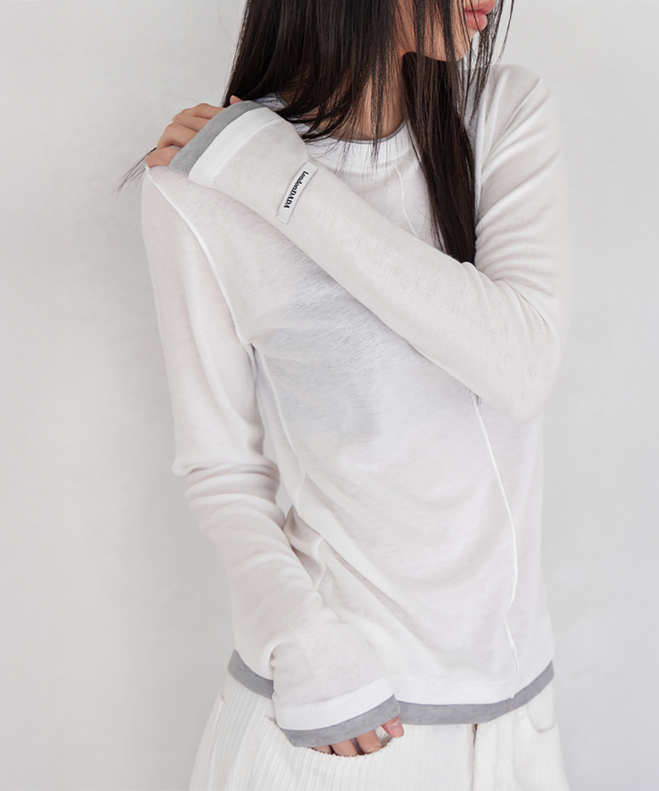 우먼즈 리브드 슬림 와이드 헨리 넥 긴소매 티셔츠 [화이트]