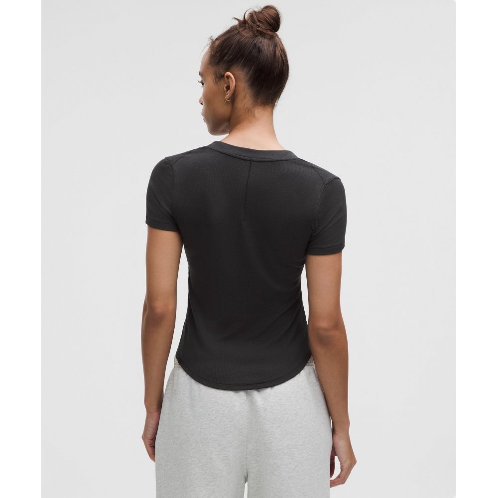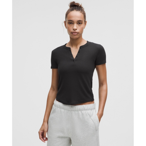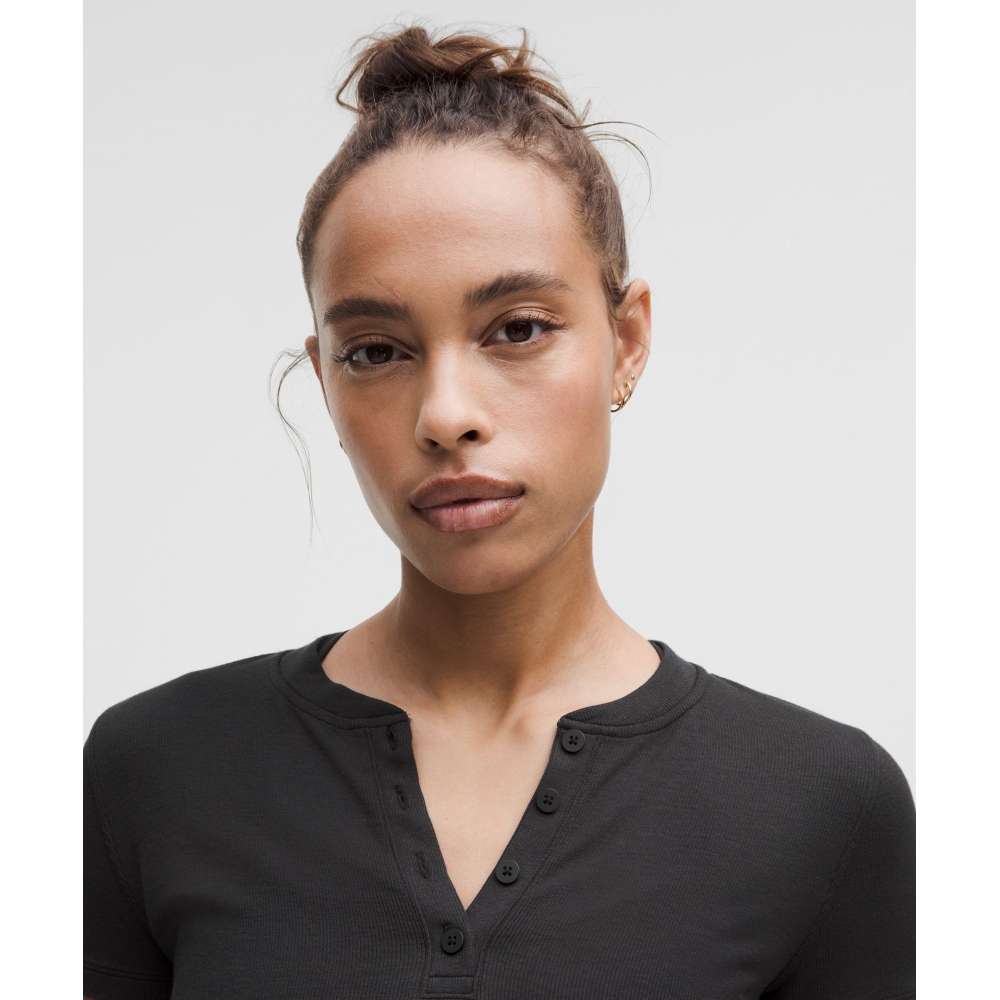몸을 부드럽게 감싸주는 가벼운 헨리넥 숏슬리브 탑으로 신축성이 뛰어나요. 정말 부드러워 어디든 함께 레이어링하기 좋아요.
