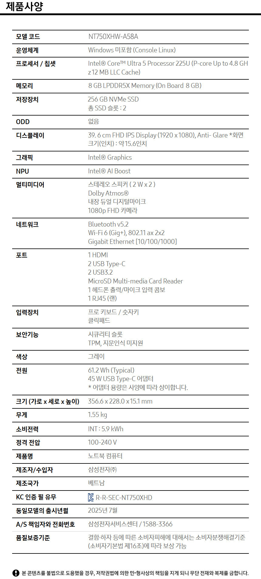 갤럭시북4 NT750XGR-A28A 가성비노트북 인텔CPU 학생 직장인 노트북