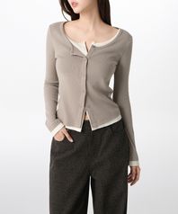 우먼즈 리브드 슬림 스쿱 넥 레이어드 저지 가디건 [더스티 베이지]