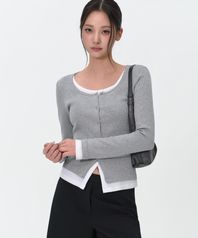 우먼즈 리브드 슬림 스쿱 넥 레이어드 저지 가디건 [멜란지 그레이]