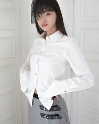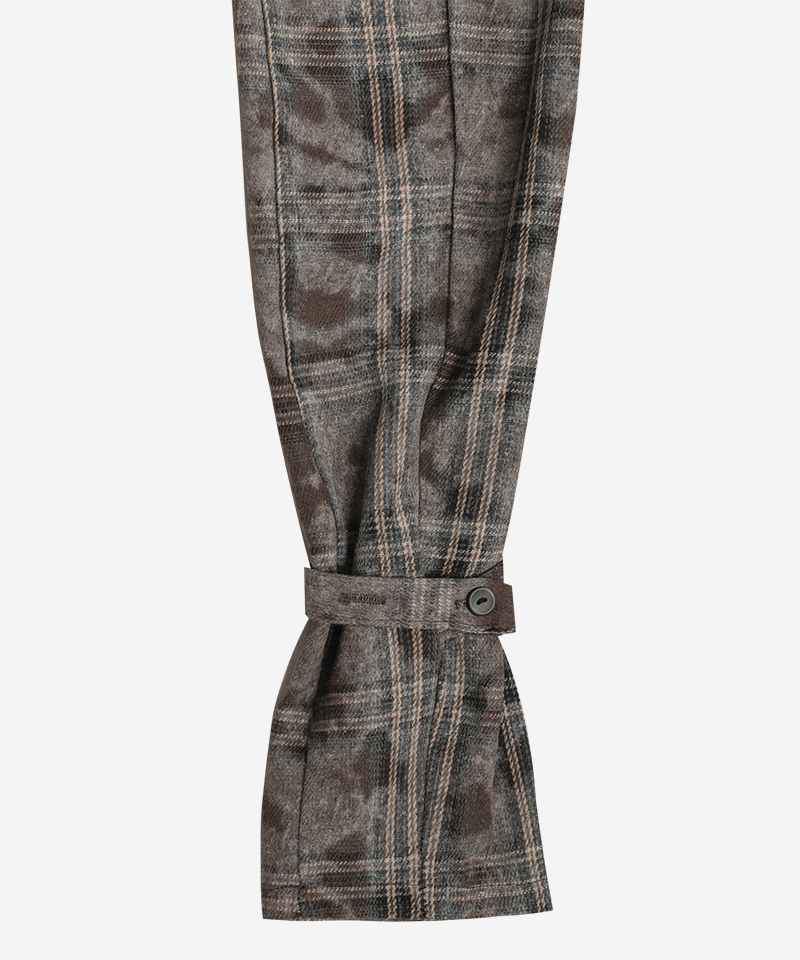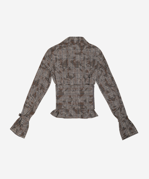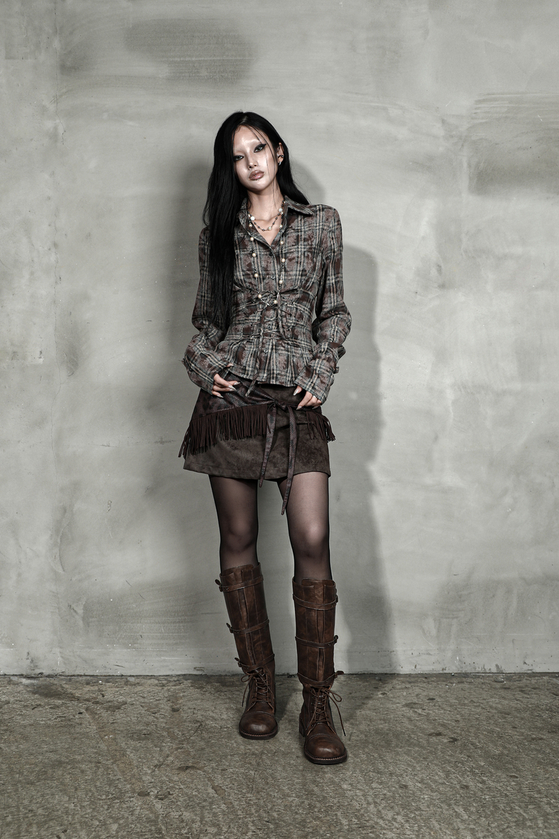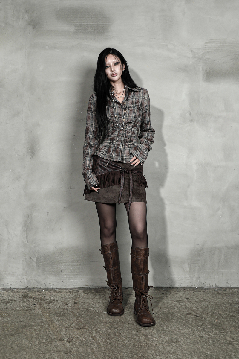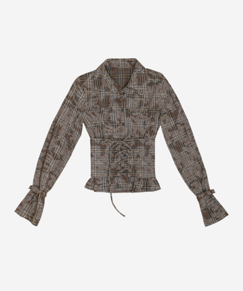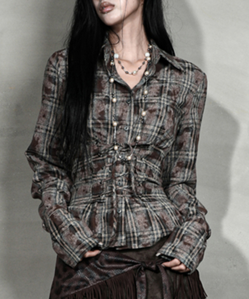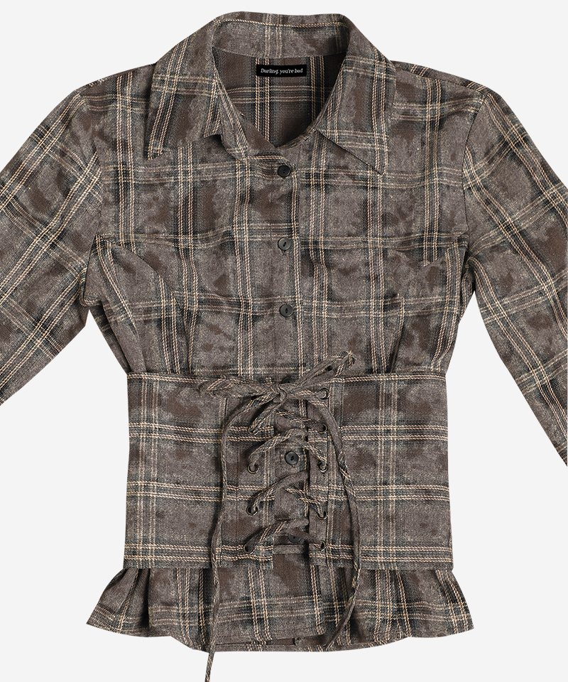 워싱된 빈티지 브라운 체크 원단의 웨이스트 코르셋 버튼업 셔츠*오픈/클로즈가 용이하도록 사이드 지퍼 부착