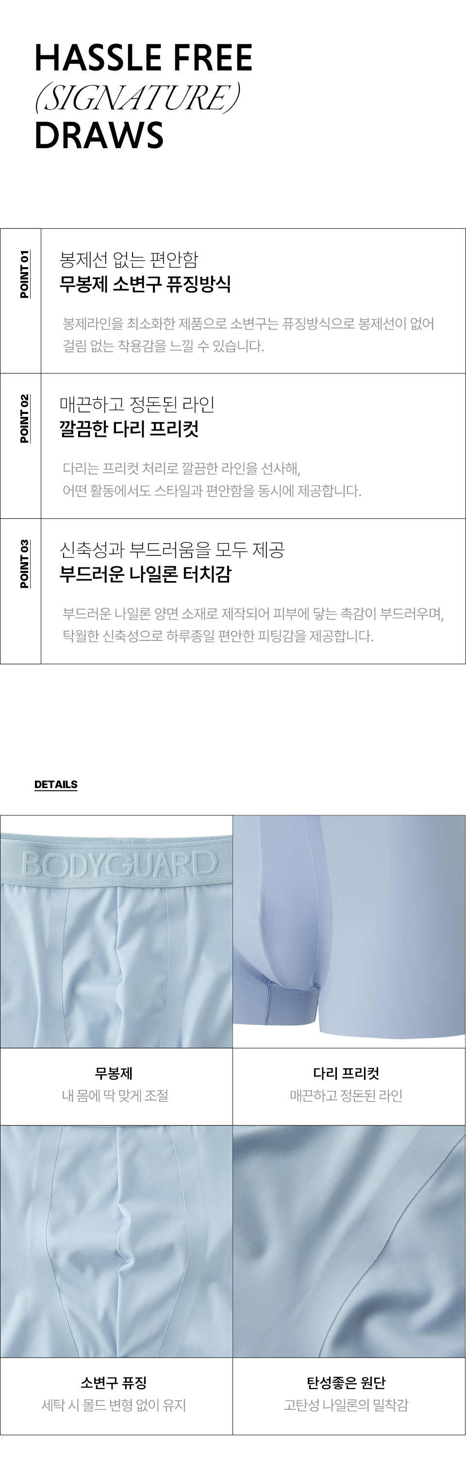 보디가드(BODYGUARD)는 새로운 변화를 더하여 일상생활 속 특별한 기분 전환을 선사하고자 합니다. 컨템포러리한 디자인과 편안한 착용감을 강점으로, 속옷을 통해 기준을 바꾸는 새로운 트렌드를 이끌고 있습니다.