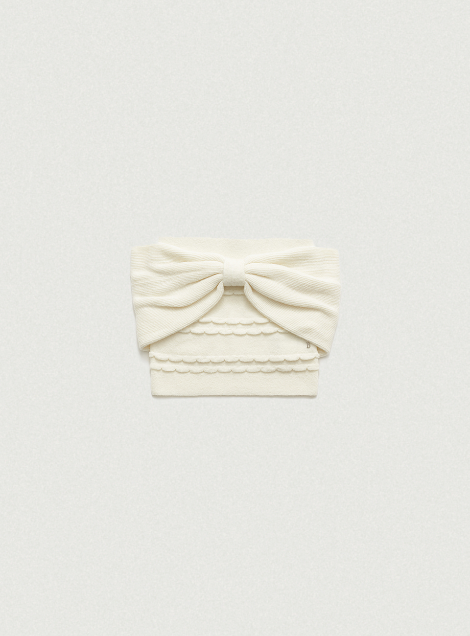 리본 모양의 매듭 구조와 크롭 타입의 짧은 총장 그리고 비 로고 금속 장식 등의 디테일