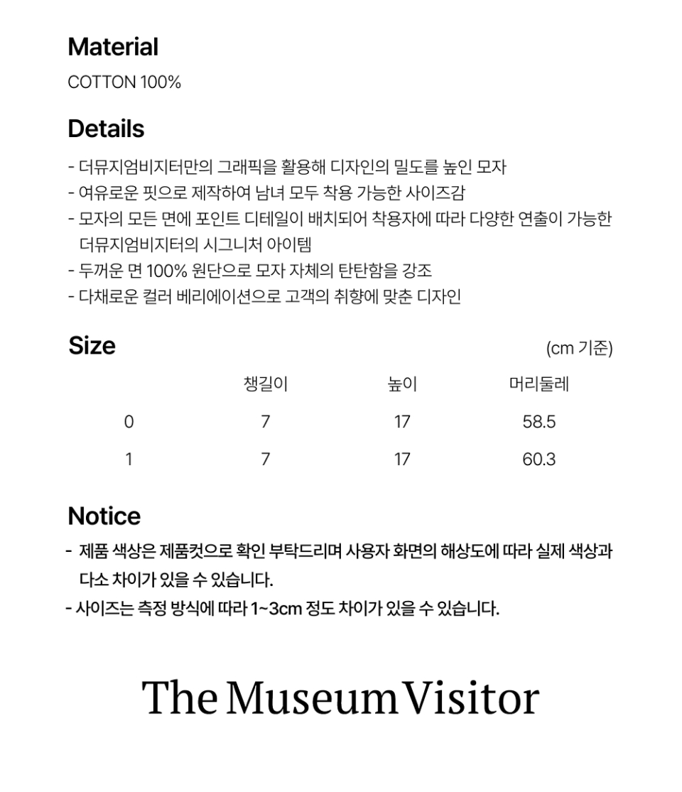 더뮤지엄비지터(THE MUSEUM VISITOR)는 2016년 디렉터 박문수의 독일 베를린 여정에서부터 시작된 브랜드입니다. 거리와 사람들에게서 느낀 자유와 사랑, 행복, 예술이 담긴 도시에서 받은 영감을 많은 이들에게 전하고자 합니다. 주로 꽃과 하트, 자연, 아이들이 디자인적 요소로 나타나며, 수작업이 가미된 차별적인 디자인 덕에 많은 마니아층의 사랑을 받고 있습니다.