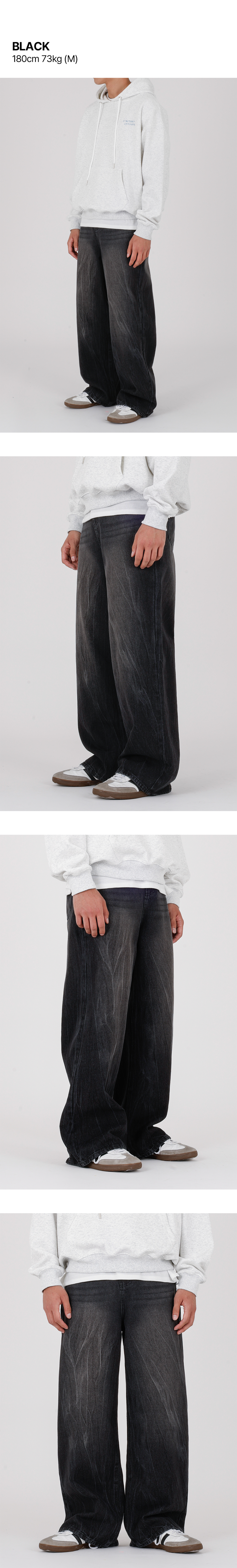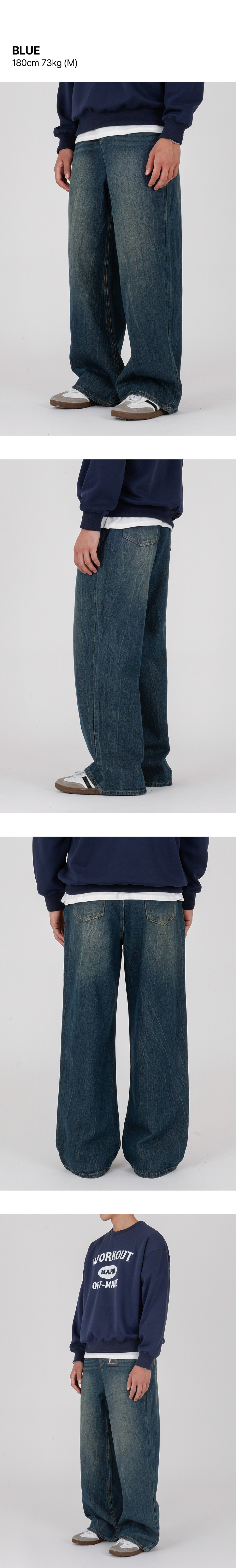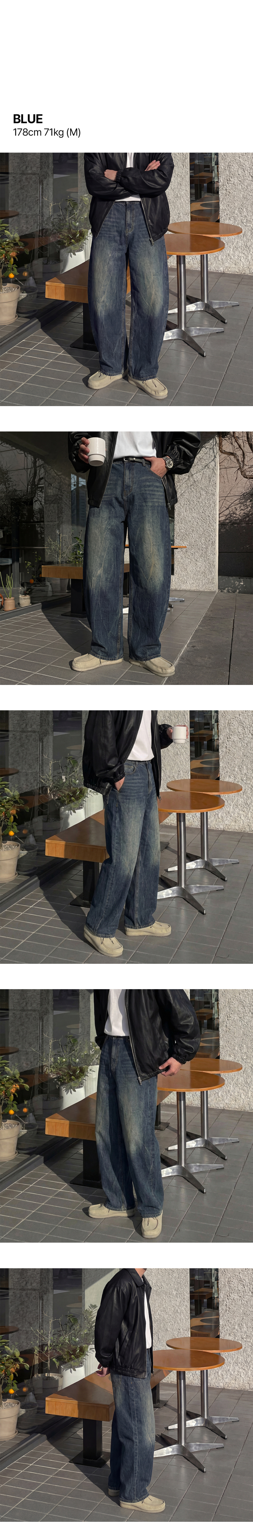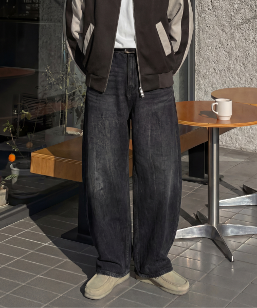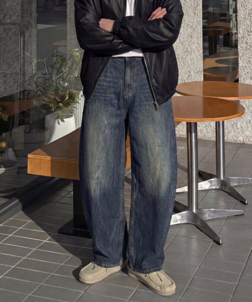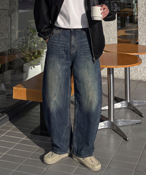 크랙 워싱 와이드 데님팬츠 커브드 청바지
