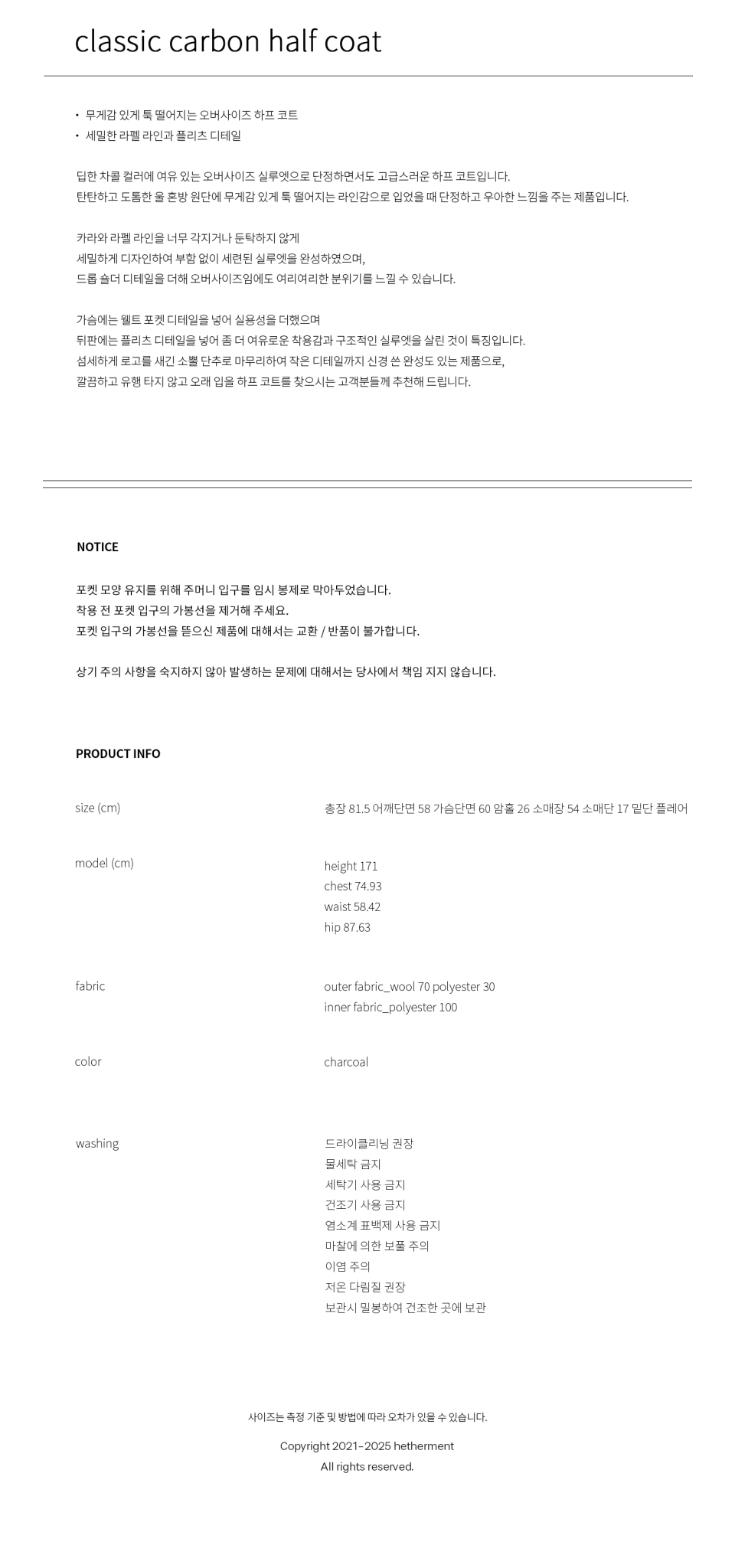 클래식 카본 하프 코트 (차콜)