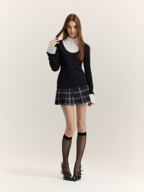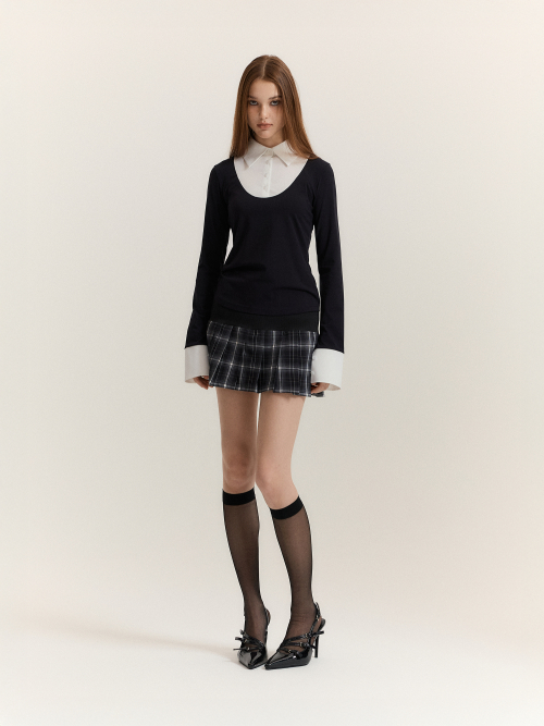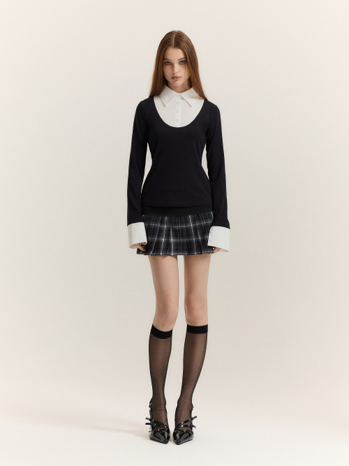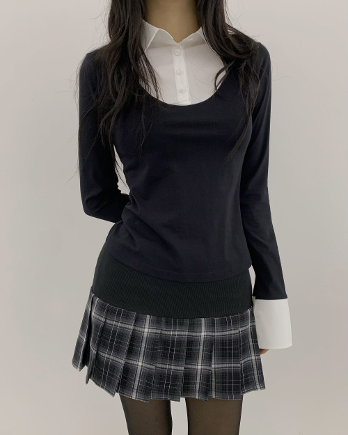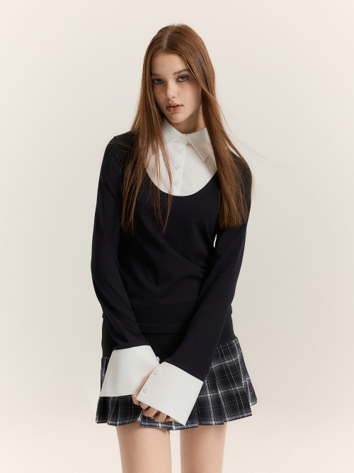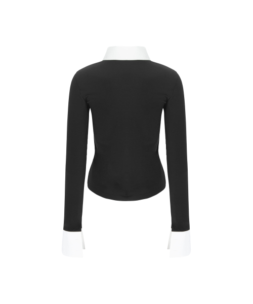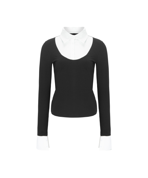 블랙 바디에 화이트 셔츠 디테일이 더해진 클래식한 레이어드 탑입니다.