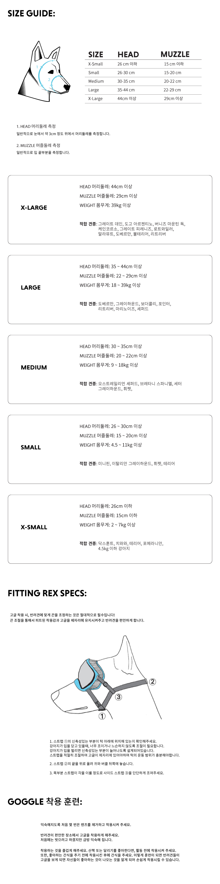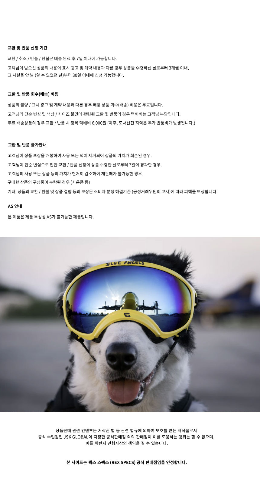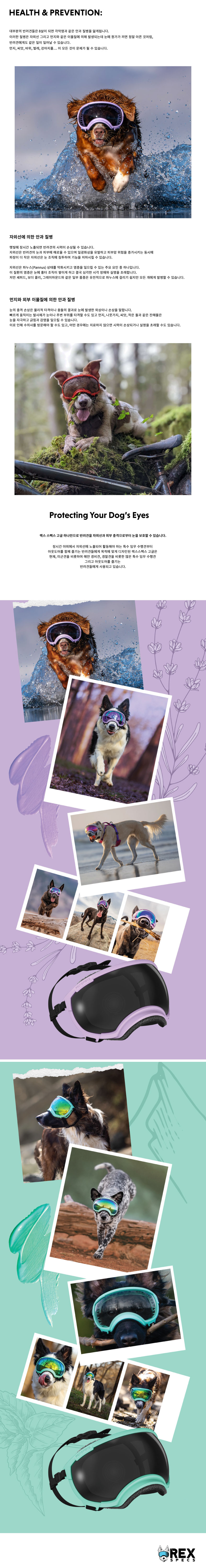 렉스스펙스(REX SPECES)는 반려견의 야외활동을 돕는 안구 보호용 고글 브랜드입니다. 견고한 디자인과 대형 렌즈로 넓은 시야를 확보할 수 있으며 착용 시에도 반려견이 불편함 없이 자유롭게 활동할 수 있습니다. 또한 UV/UVB 차단 코팅 처리로 각종 안구 질환 예방에 효과가 있습니다.