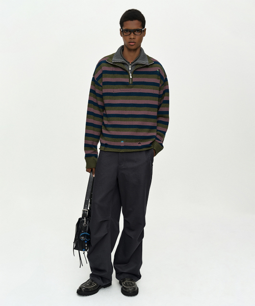 DOUBLE LAYERED STRIPE HALF ZIP-UP SWEATER atb1451m(BEIGE/BROWN)