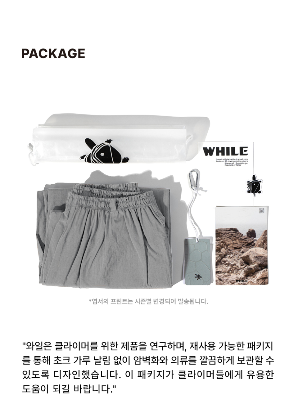 와일(WHILE)은 클라이밍을 즐기는 '동안' 클라이머를 더욱 즐겁게 만들어 줄 수 있는 라이프 스타일 제품을 만들어 공유하는 브랜드입니다. 와일은 가벼운 몸과 마음으로 나의 움직임에 집중할 수 있도록 가볍고 내구성 좋은 제품을 제공하기 위해 계속해서 고민합니다. 클라이밍을 즐기는 동안만큼은 일상 속 무거운 짐을 잠시 벗어 두고, 오로지 나만의 즐거움에 몰두할 수 있길 바랍니다.