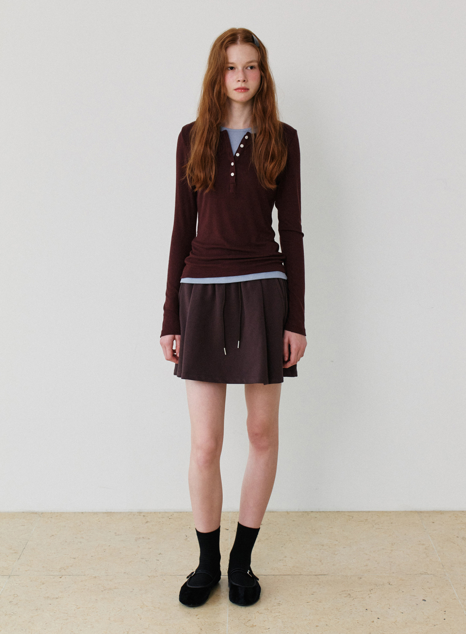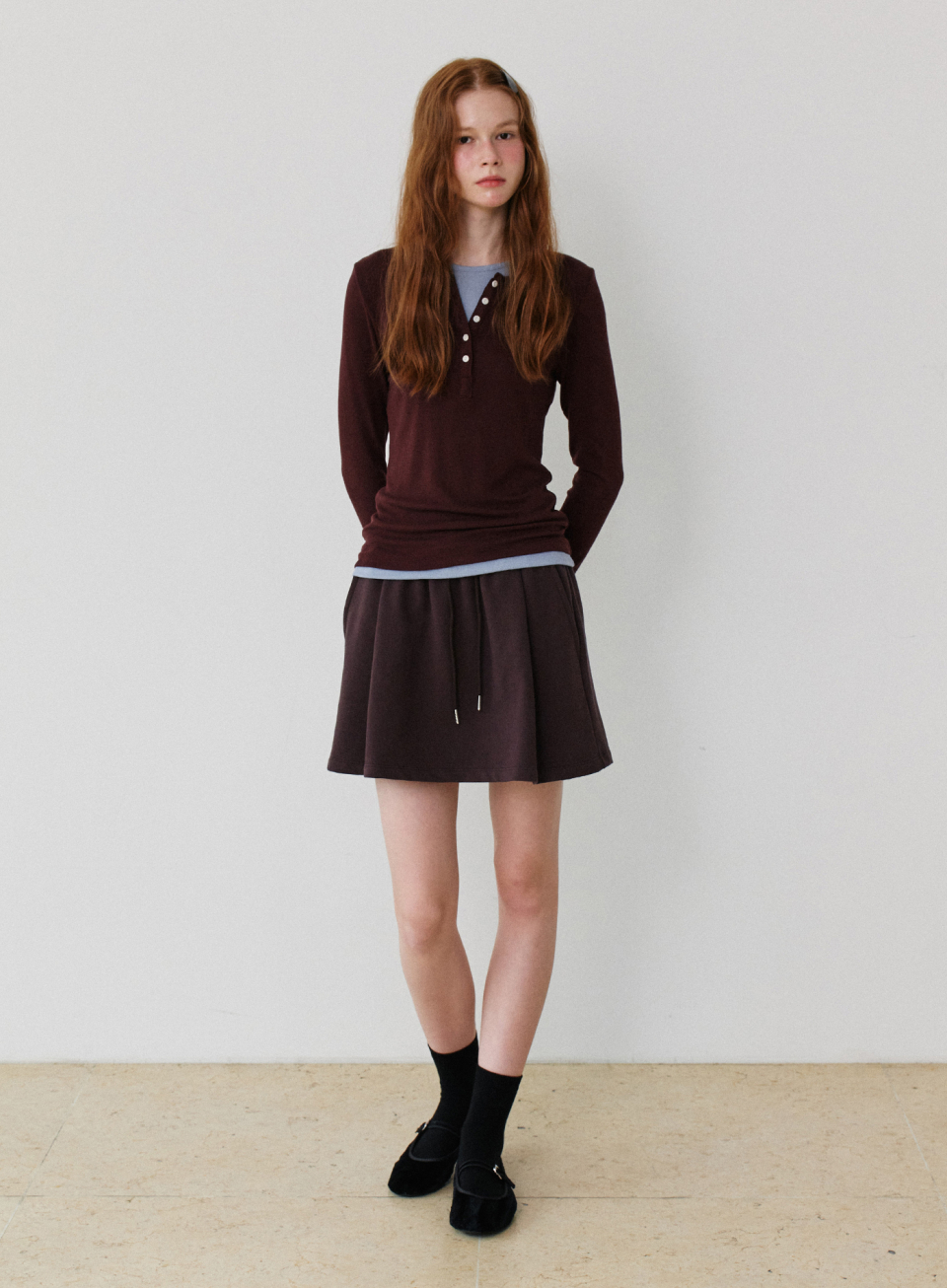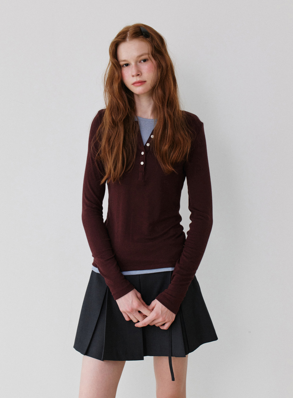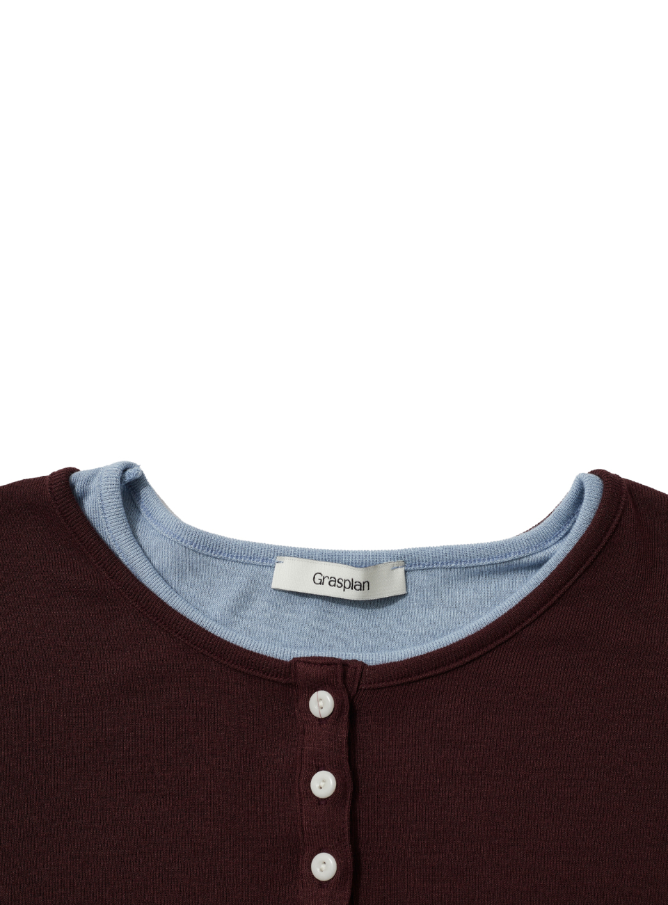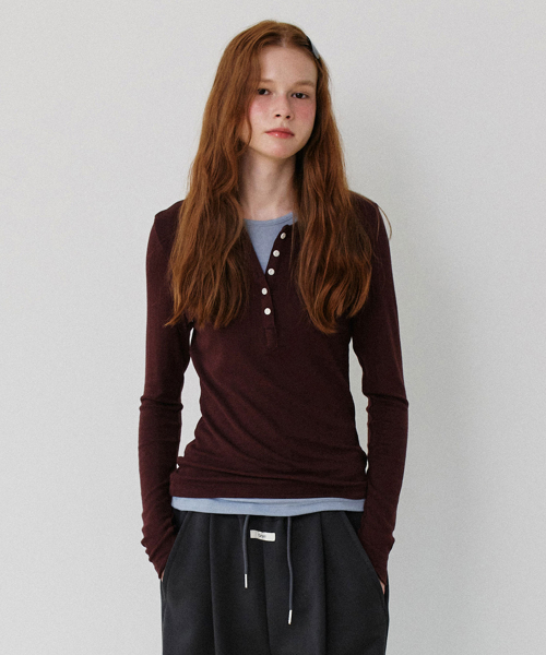 - 헨리넥과 라운드넥이 레이어드 된 디자인으로 버튼 오픈시컬러배색 포인트