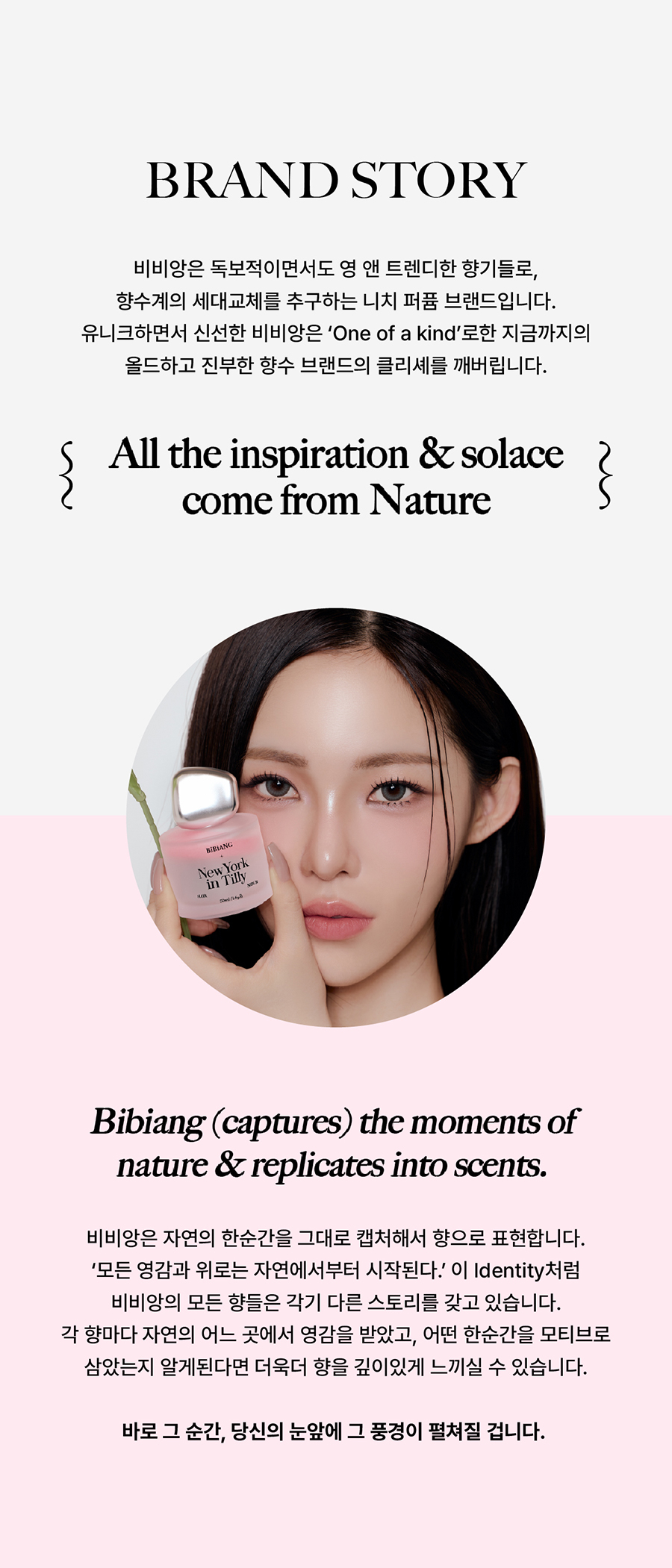 비비앙(BIBIANG)은 독보적이면서도 유니크하고, 영 앤 트렌디한 향기들로 향수계의 세대 교체를 추구하는 센세이셔널한 니치 퍼퓸 브랜드입니다. 자연의 한순간을 그대로 캡처해서 향으로 표현하며, 각 향마다 독특한 스토리텔링을 담고 있습니다.