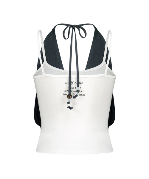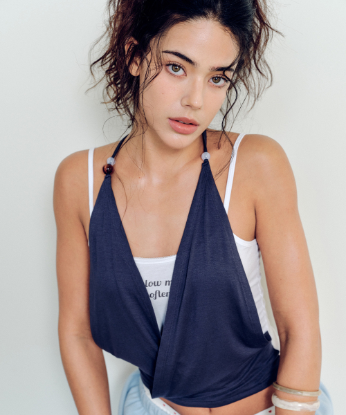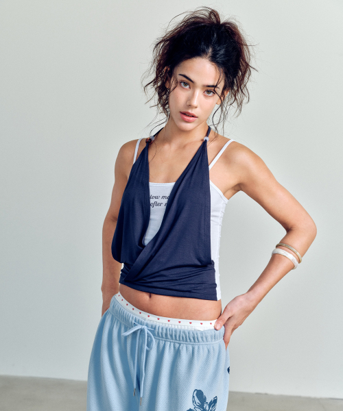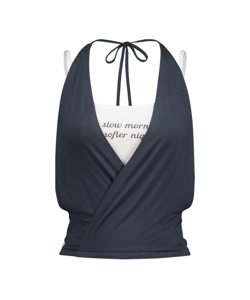이너 슬리브리스 & 넥라인을 감싸는 랩 스타일의 홀터넥이 이중 디자인으로 구성되어,