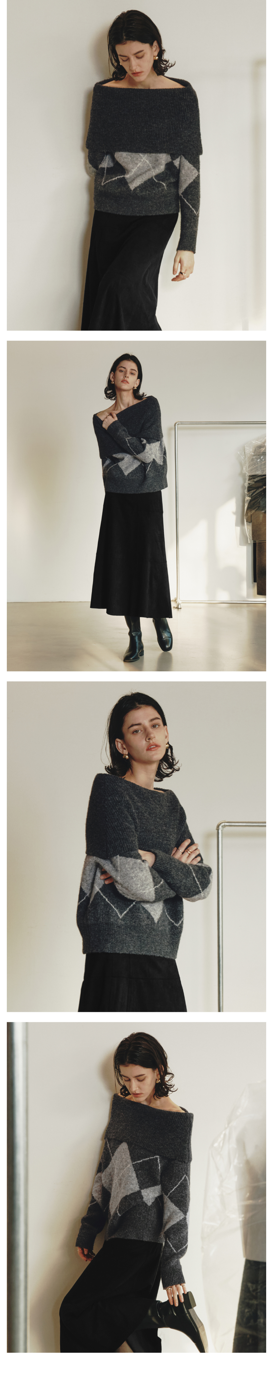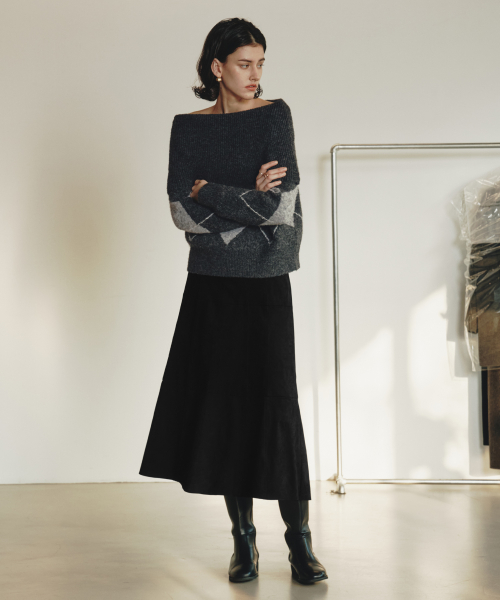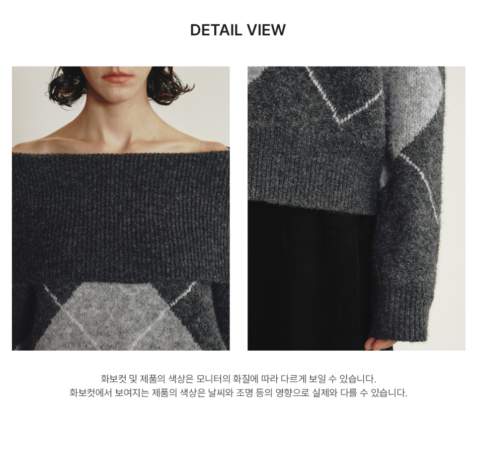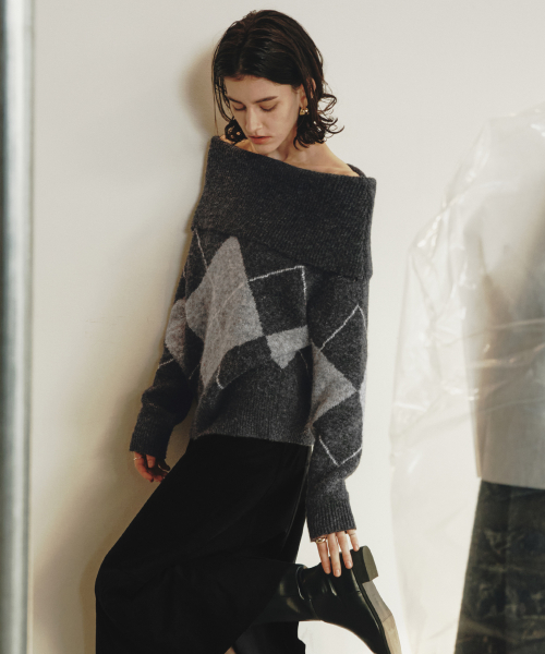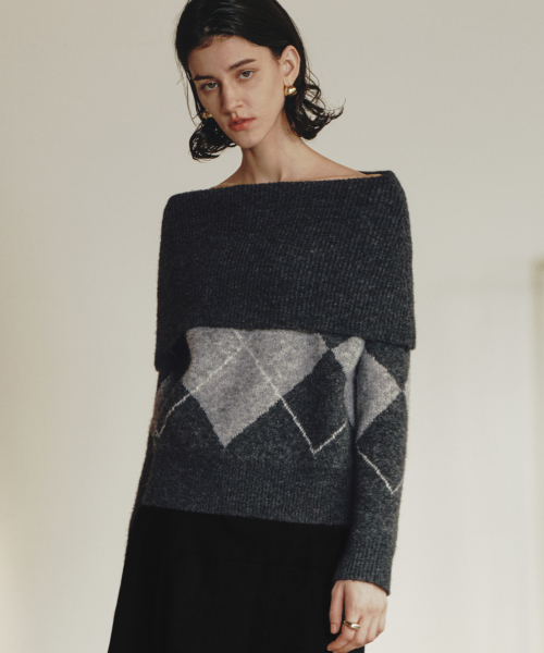 르제로 아가일 오프숄더 울 스웨터 / 차콜