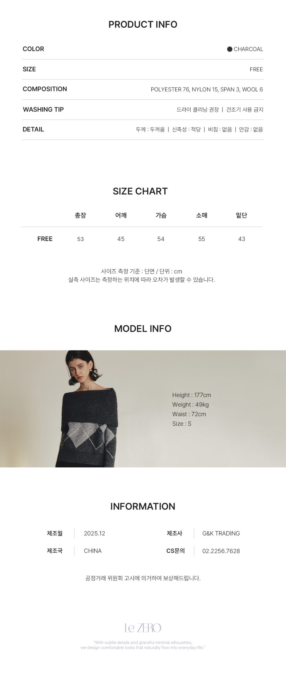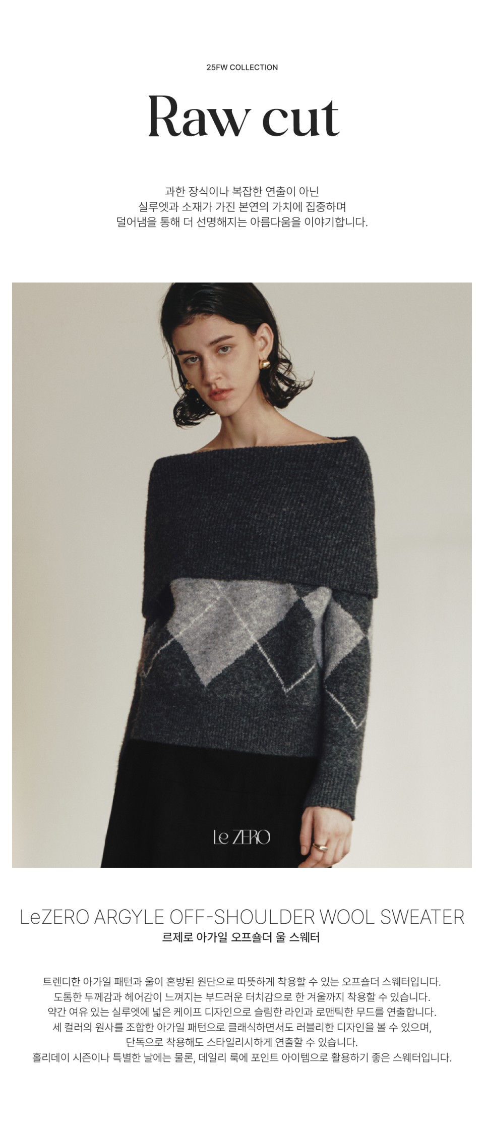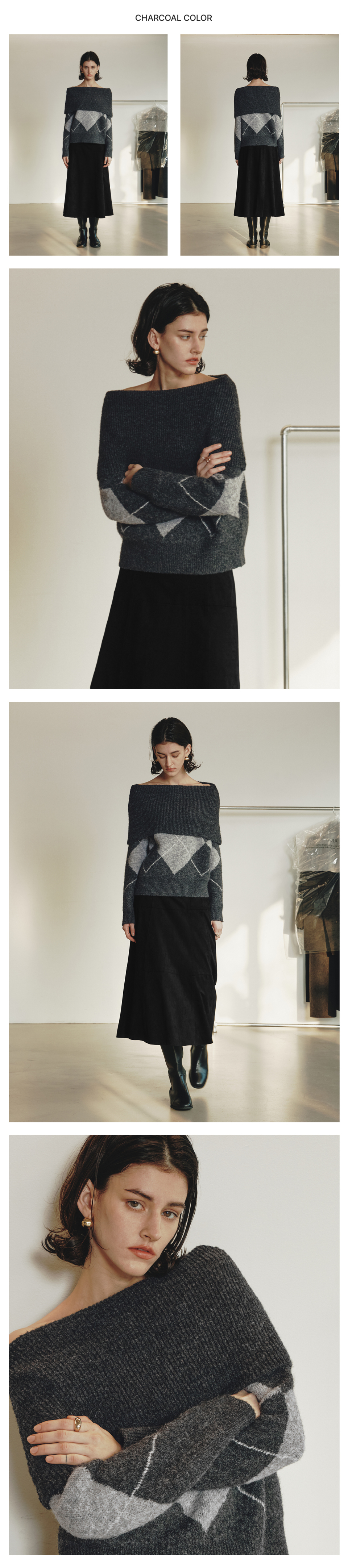 르제로 아가일 오프숄더 울 스웨터 / 차콜