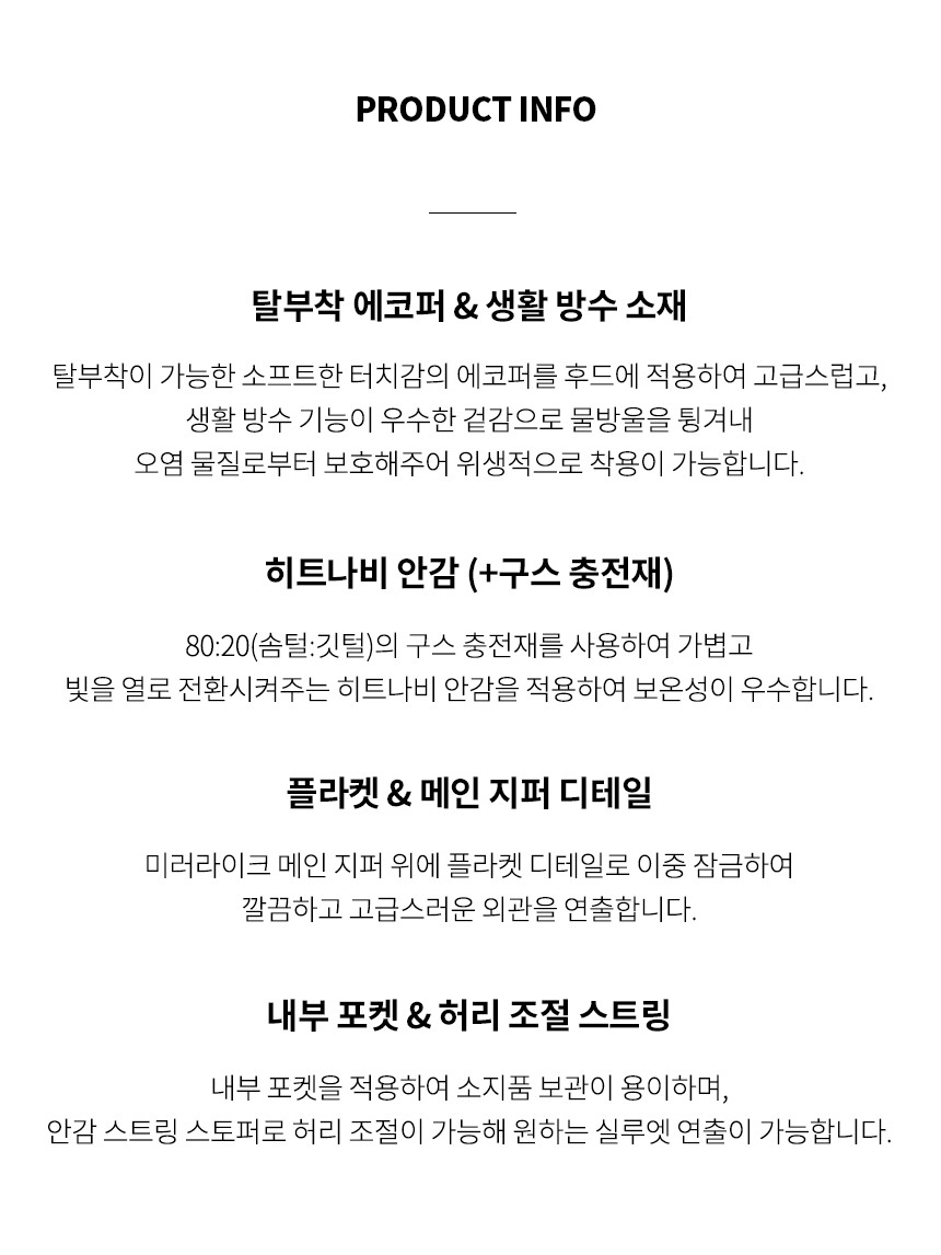 | 소재 | [BLK0]겉감:폴리에스터(100),[BLK0]모자털:폴리에스터(100),[BLK0]배색:나일론(80)폴리우레탄(20),[BLK0]안감1:나일론(100),[BLK0]안감2:폴리에스터(100),[BLK0]안감3:폴리에스터(100),[BLK0]충전재:거위솜털(80)거위깃털(20) (입고 시기에 따라 정보가 상이할 수 있어, 수령하신 상품의 라벨을 참고하시기 바랍니다.) |