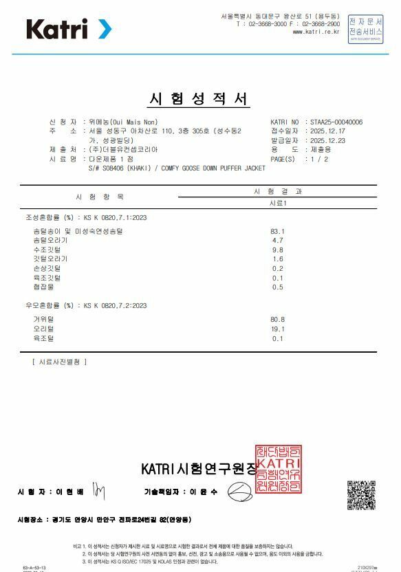 구스다운 80:20 충전재를 사용해 가볍고 따뜻한 착용감을 제공합니다.