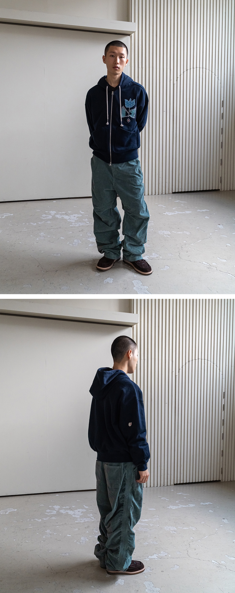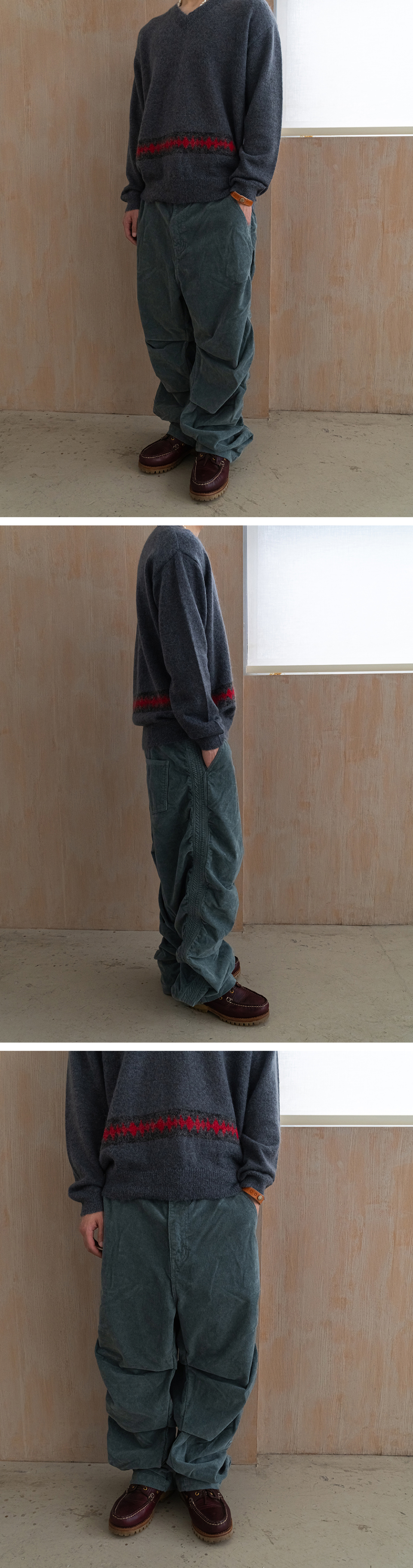 - 테이퍼드 핏을 기반으로 자연스럽게 주름이 쌓이는 실루엣