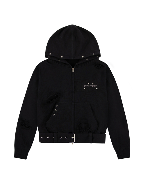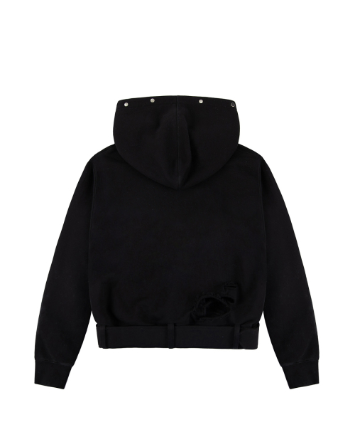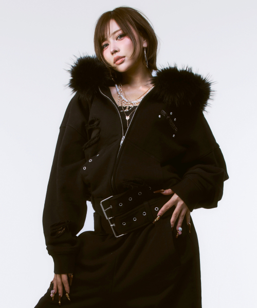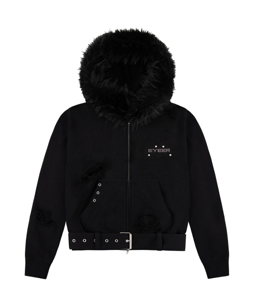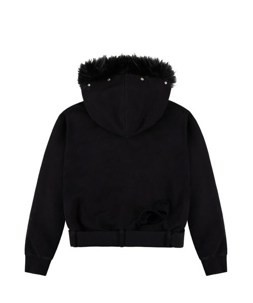 Belted Fur Hoodie Zip-up - Black