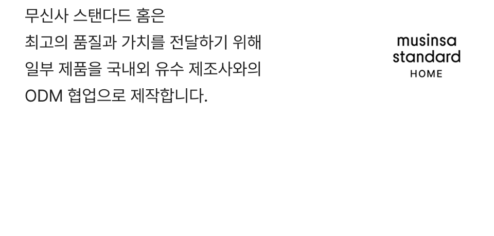 무신사 스탠다드 홈(MUSINSA STANDARD HOME)은 일상생활 곳곳에 손쉬운 해결책을 제시하는 라이프스타일 브랜드입니다. 본연의 기능에 충실한 제품을 합리적인 가격으로 선보여 누구나 자신에게 최적화된 생활방식을 실현하도록 돕습니다.