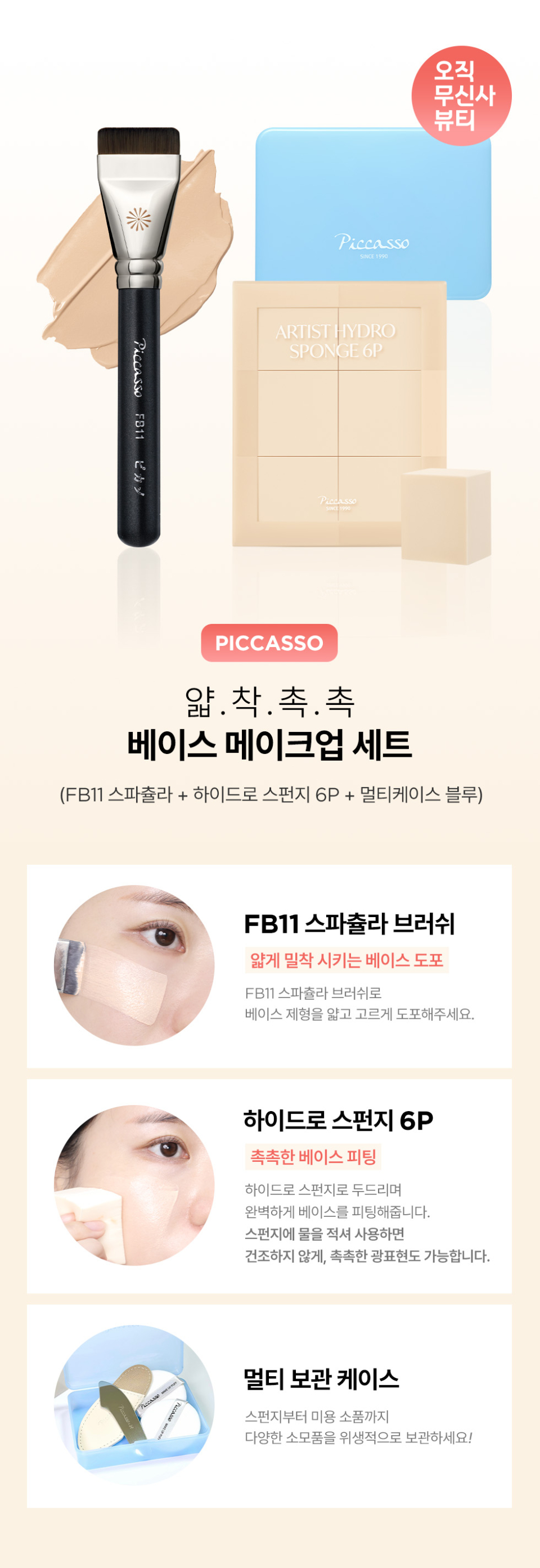 피카소(PICCASSO)는 초보자들도 전문가처럼 메이크업을 할 수 있도록 도와주며, 메이크업 제품력을 살리고 디테일한 표현을 돕는 메이크업 브랜드입니다.