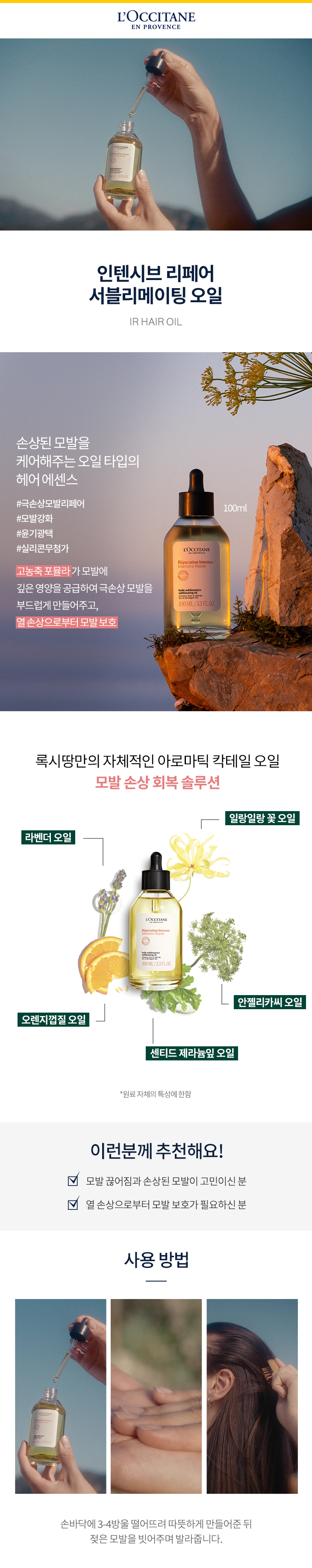 | 사용방법 | 손바닥에 3-4방울 떨어뜨려 따뜻하게 만들어준 뒤 젖은 모발을 빗어주며 발라줍니다. |