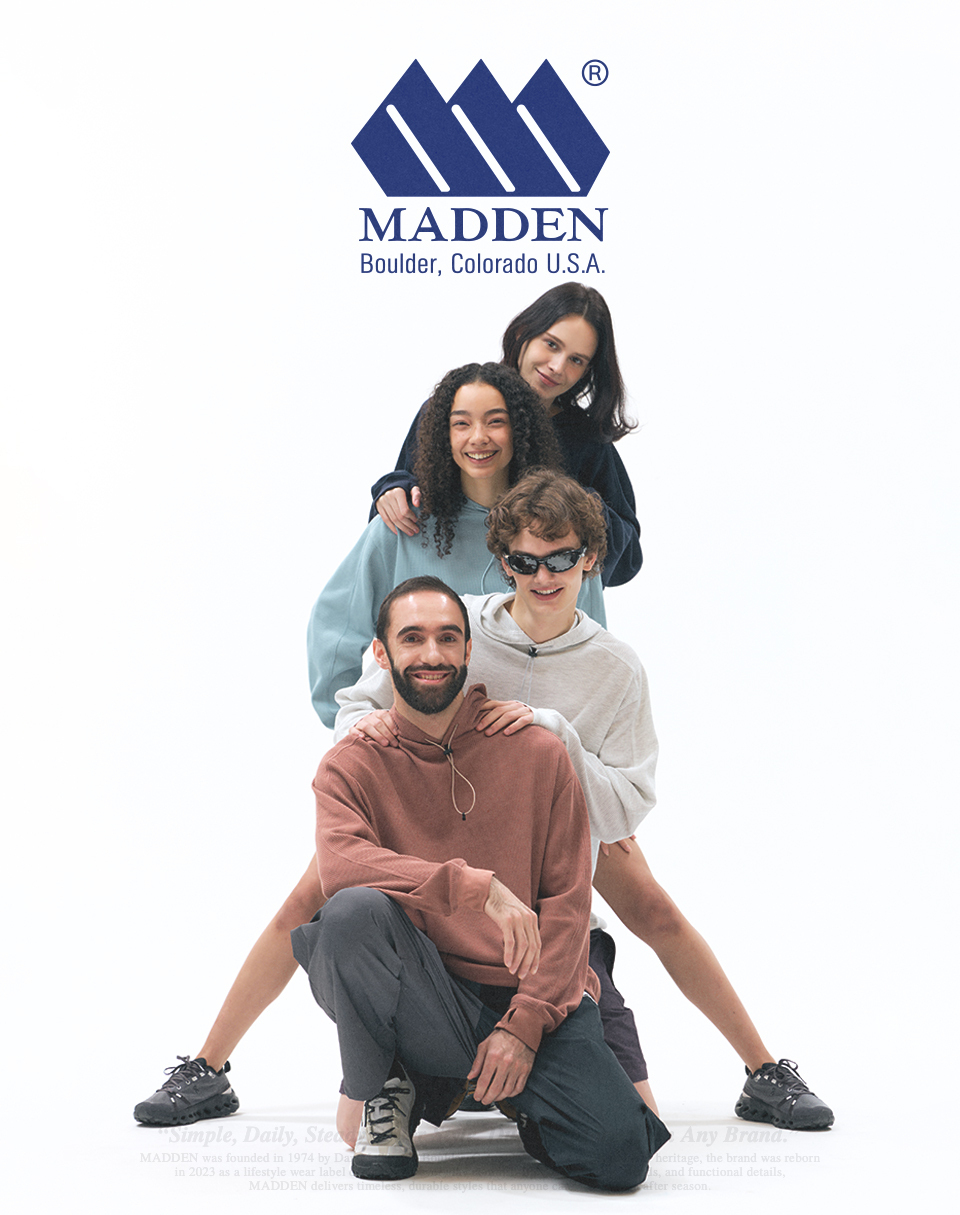 매든(MADDEN)은 1974년 COLORADO주의 BOULDER에서 DAN MADDEN(댄 매든)에 의해 창립되었으며, 많은 시간동안 다양한 스타일의 제품으로 아웃도어 매니아들과 소통해왔습니다. 2023년 더욱 발전된 모습으로 캠핑, 하이킹, 싸이클링 등 다양한 아웃도어 활동에서 영감을 받아 언제 어디서나 편안하게 착용할 수 있는 라이프스타일 웨어 브랜드로 재 탄생하였습니다. 브랜드의 헤리티지, 트렌드와 실용적이고 기능적인 디테일을 연구해 적용한 디자인으로 매 시즌마다 새로워진 매든(MADDEN)으로 누구나 착용할 수 있는 패션을 선보입니다. "Simple, Daily, Steady Seller Style, Durable More Than Any Brand”