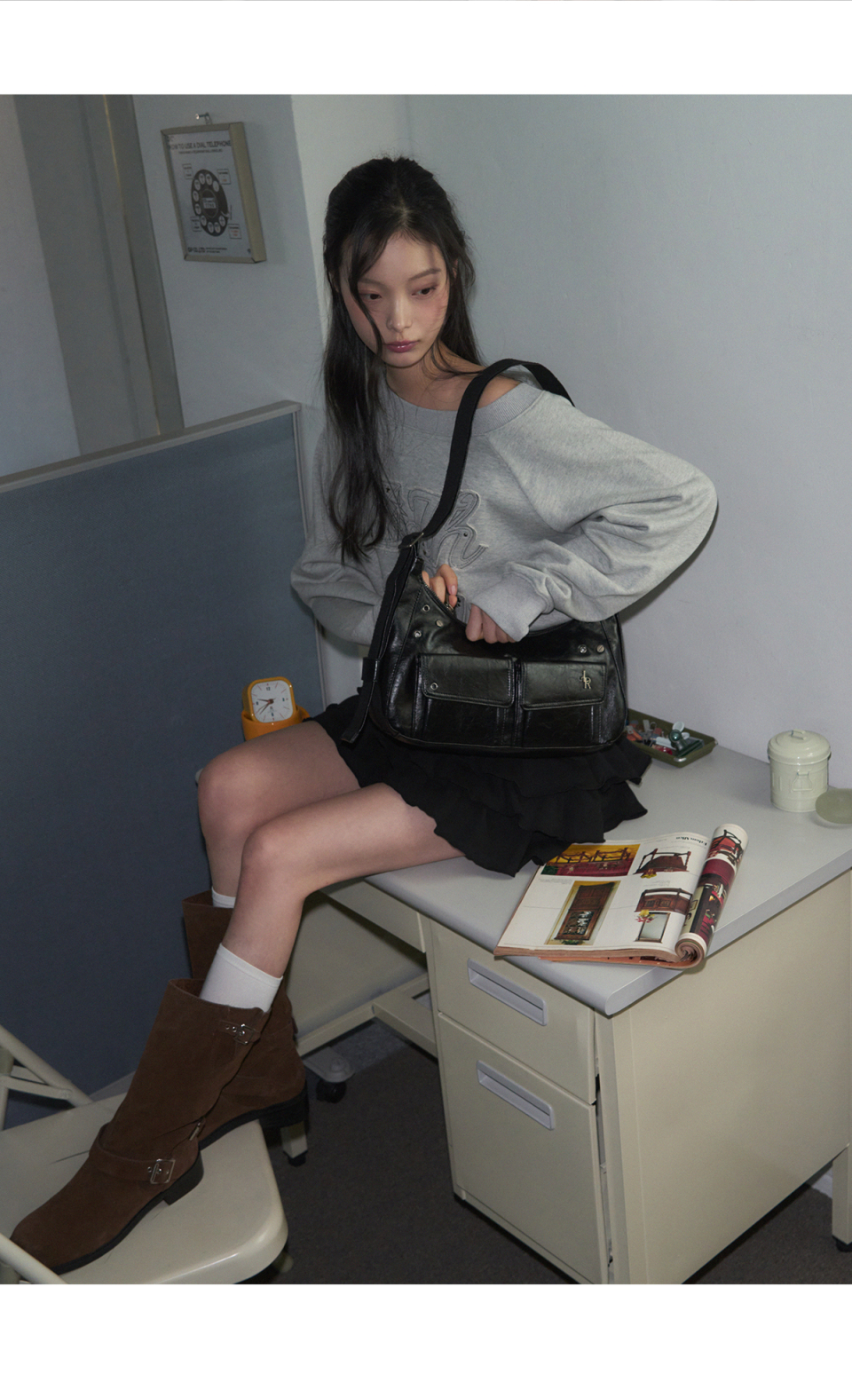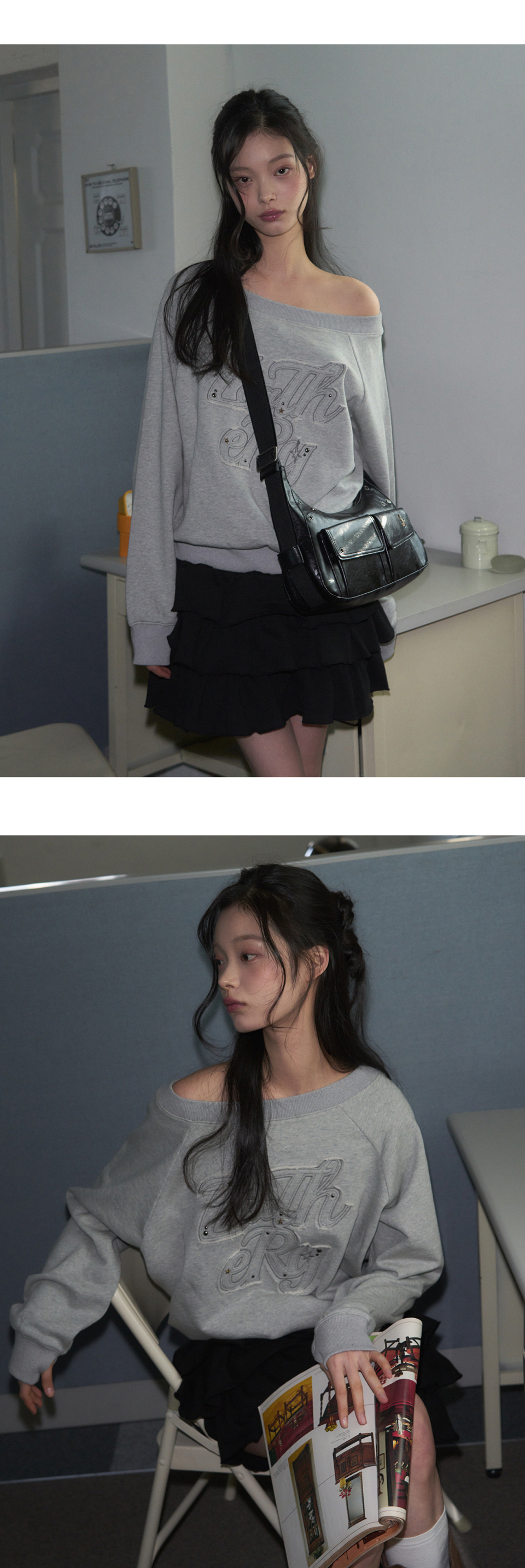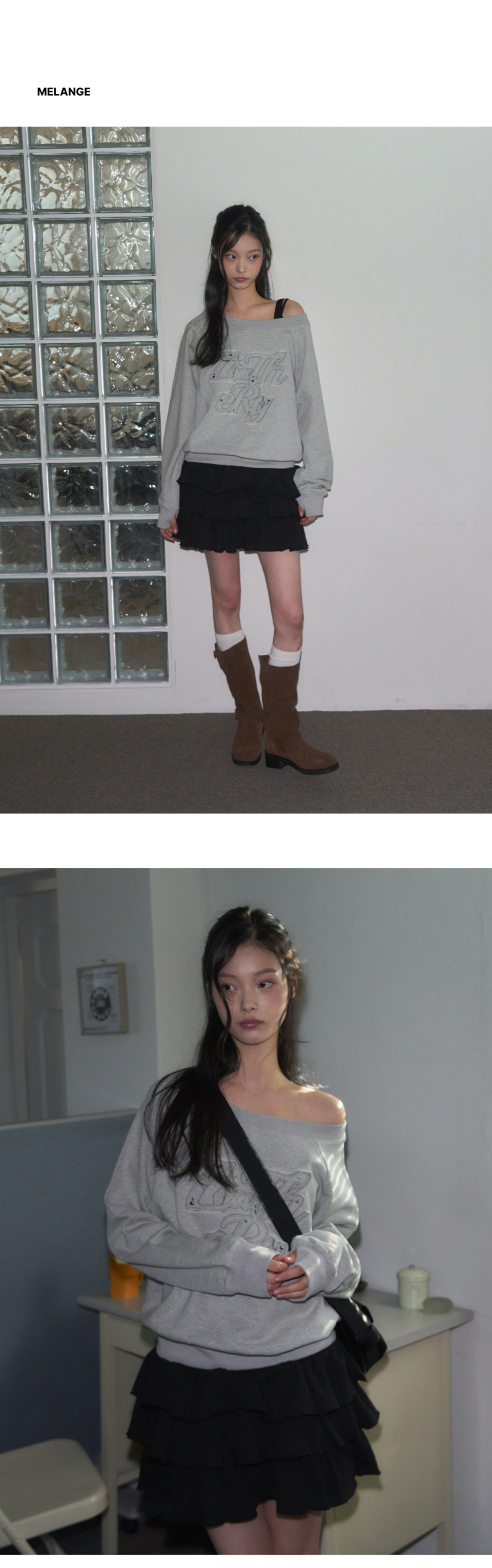 오프숄더 아플리케 스웻셔츠 [MELANGE]