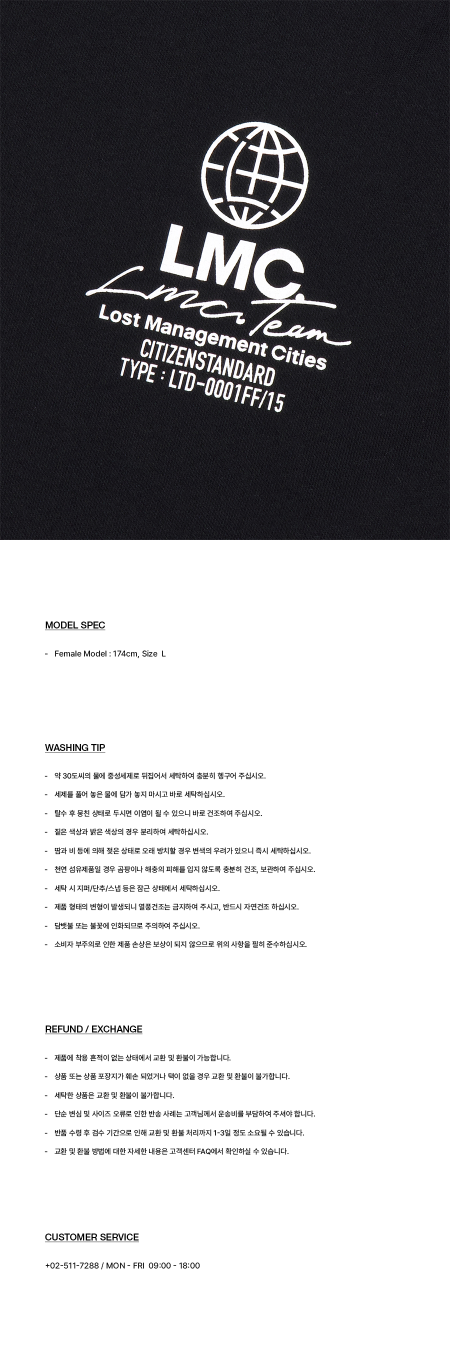 엘엠씨(LMC)는 2015년 론칭하여 ‘Lost Management Cities’를 모티프로 각자의 방식으로 살아가는 세대를 담아내고, 변화하는 환경 속에서 동시대의 문화적 코드를 재해석하며, 다양한 협업과 프로젝트를 통해 스트리트 감성을 확장하는 브랜드입니다.