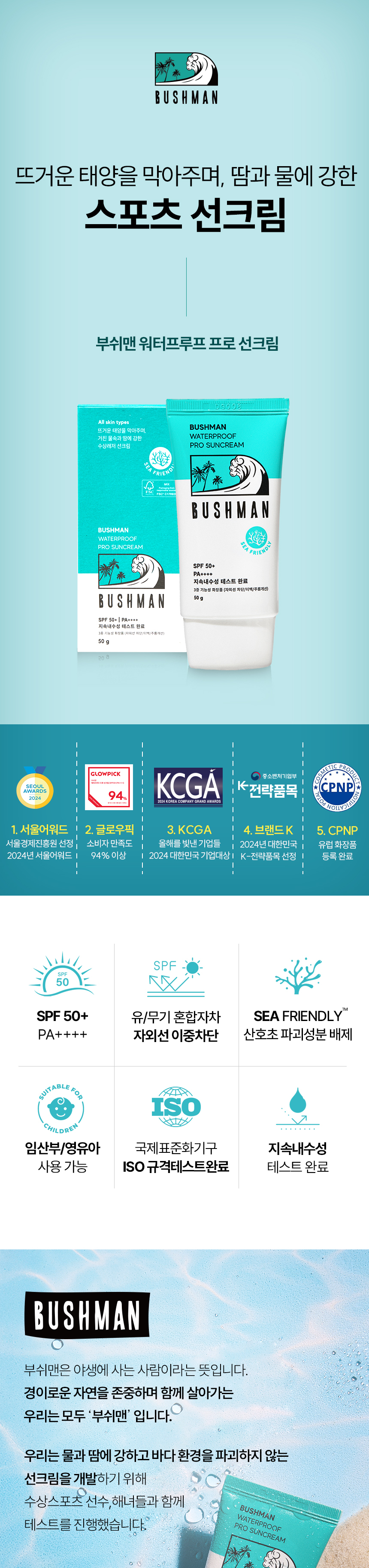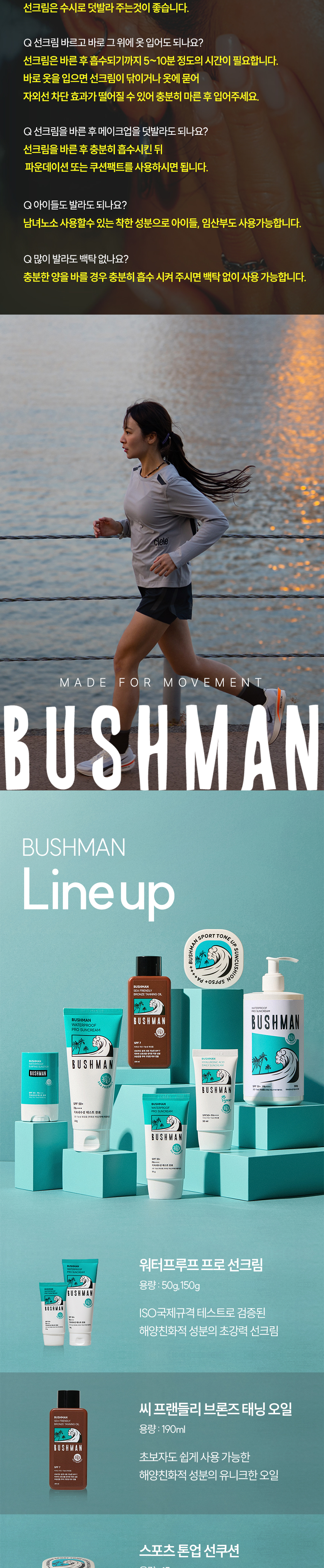 부쉬맨(BUSHMAN)은 태양 아래 모든 활동에서 피부와 자연을 지키고 도전을 응원하는 서머뷰티 브랜드입니다.