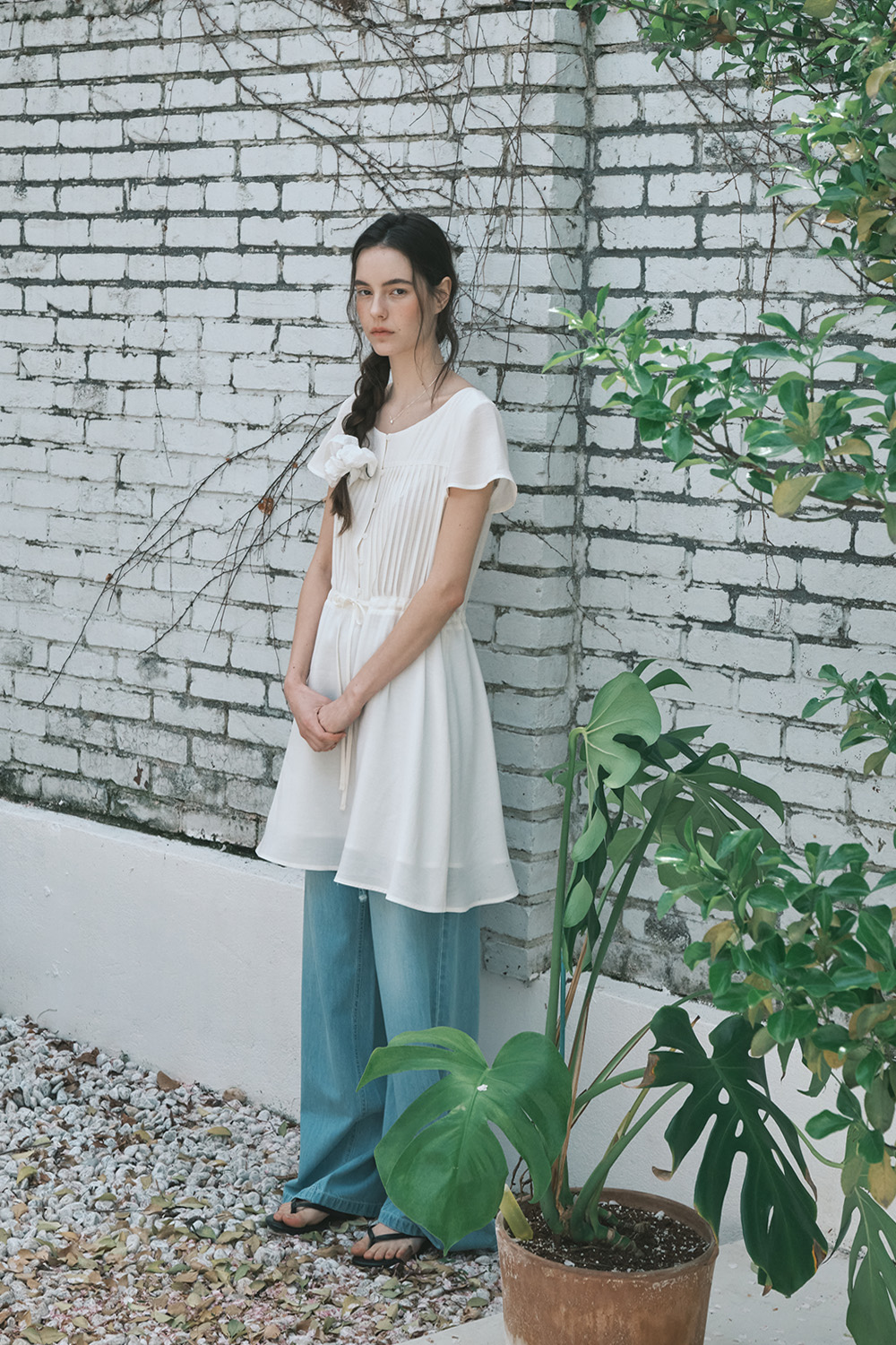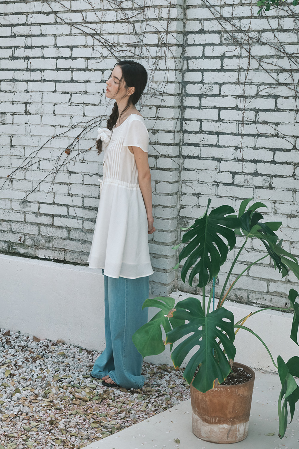 셔링 타이 블라우스_아이보리